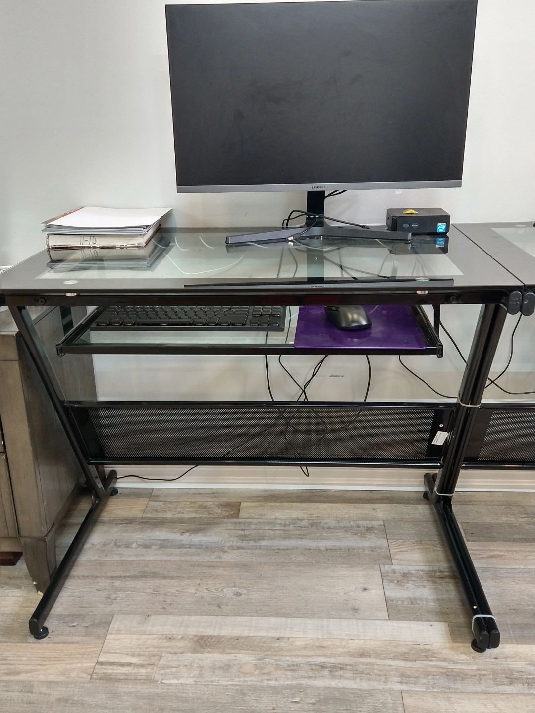 Modern glass computer desk. Black metal frame. Lower shelf for keyboard and mouse.