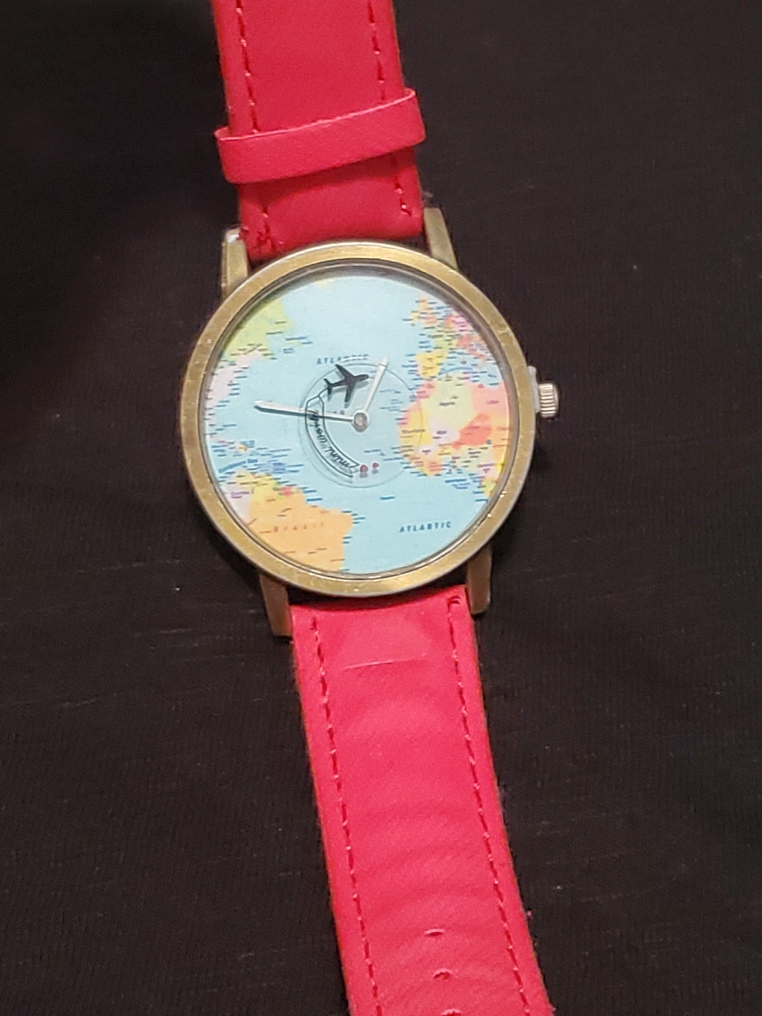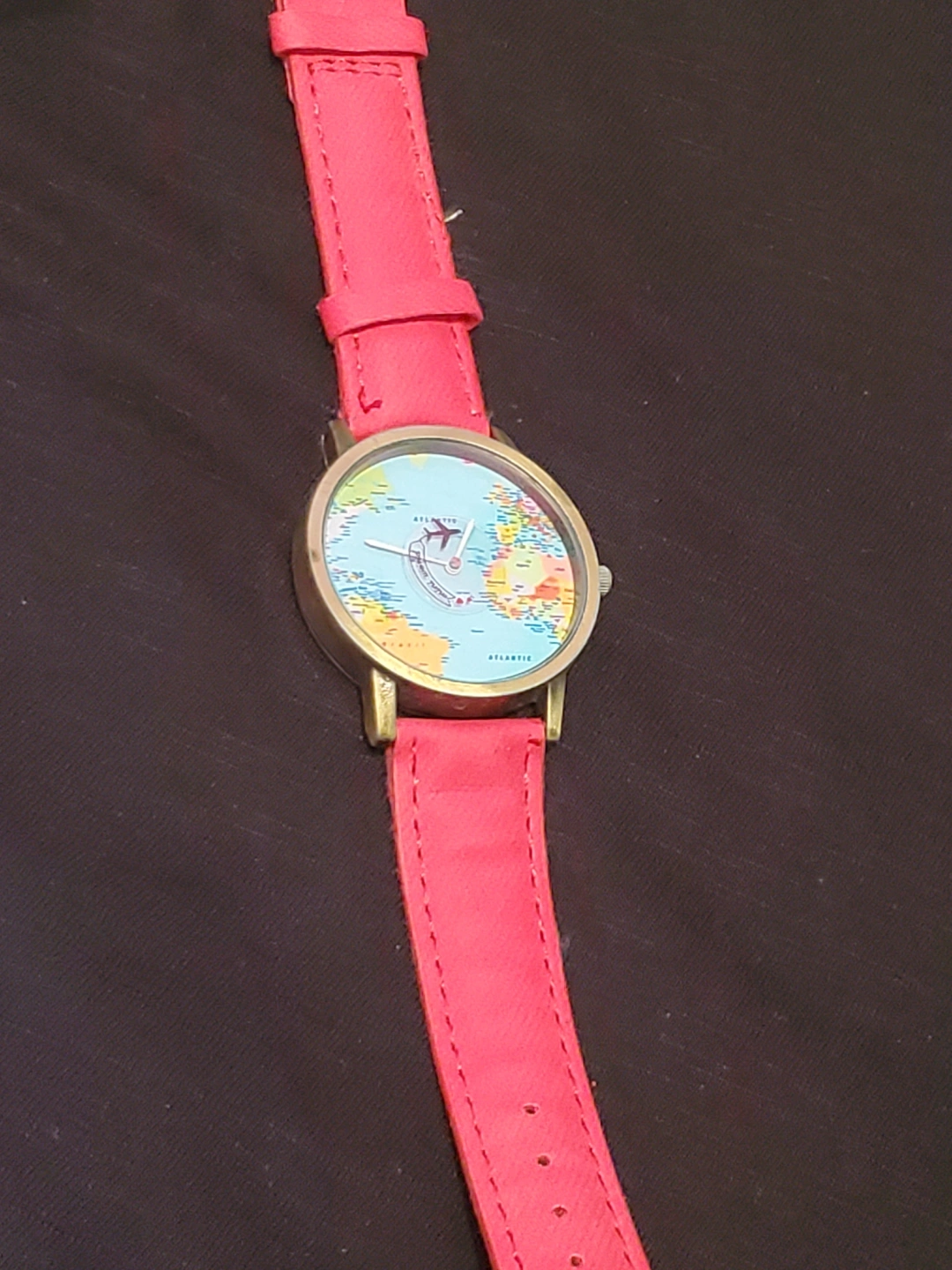 Analogue wristwatch. Features a world map face and a bright pink leather band. Unique design, perfect for travellers.