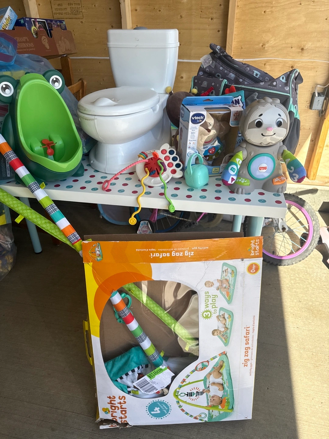 Bundle of baby items including a toddler potty, urinal, various toys, and a Bright Starts Zig Zag Safari playmat. VTech toys included. Some wear and tear expected.