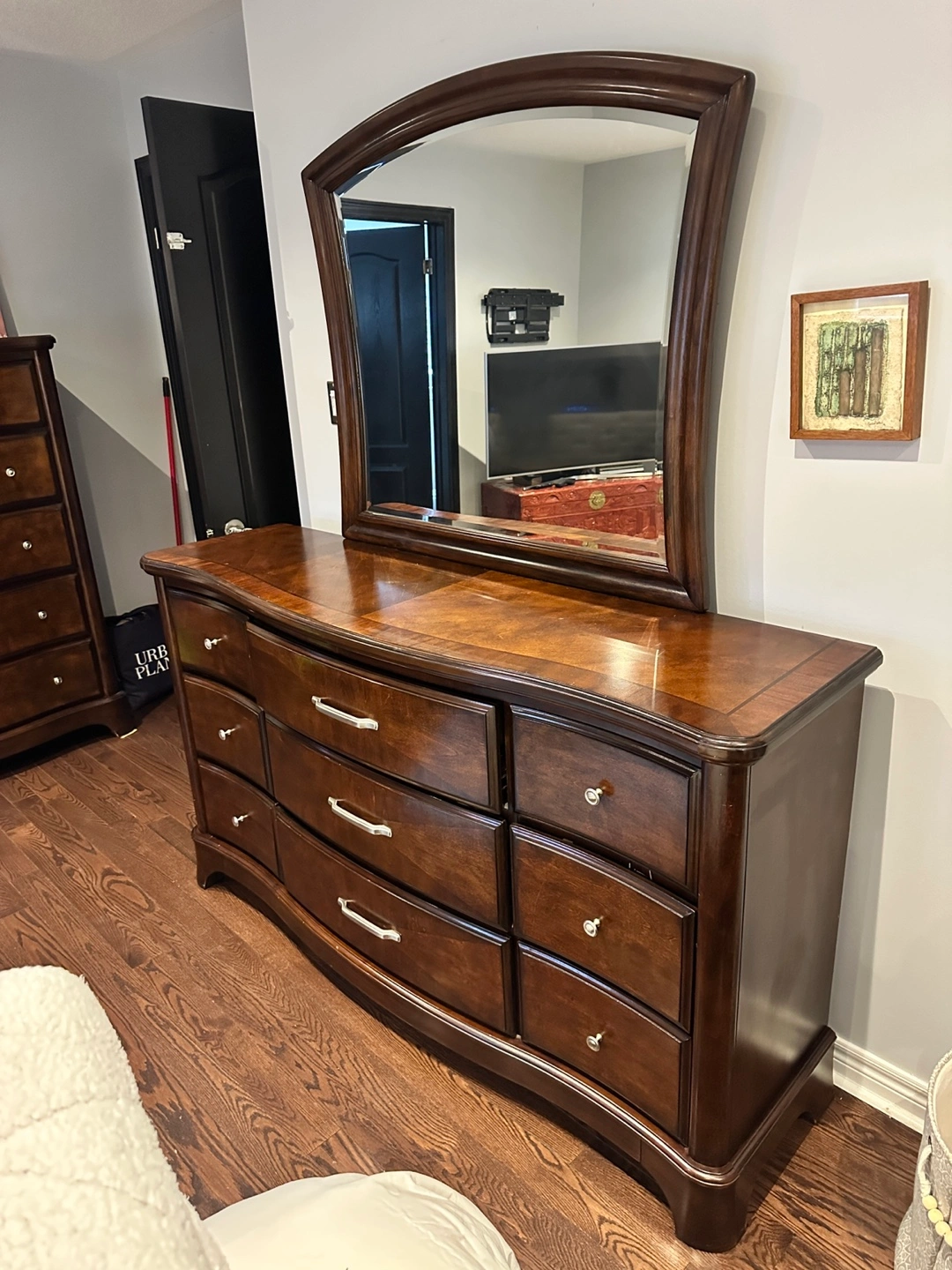 Buy & SellDark Brown Wooden Dresser with MirrorDark Brown Wooden Dresser with Mirror$200Nine-drawer dresser, curved design. Features a large attached mirror. Dark brown wood finish. Good condition. Pickup onlyConditionLike newWHERE TO MEETCheck LocationView MapSELLERverifiedhaleyWoodbridge W964 reviews3 chats·1 favorites·41 views