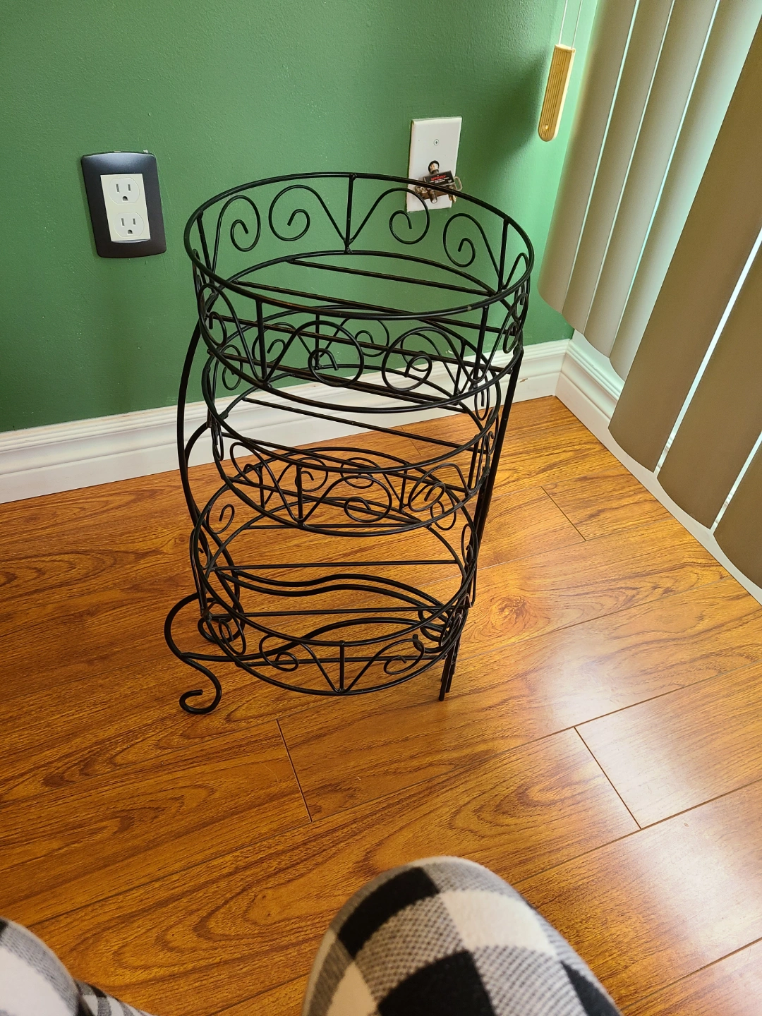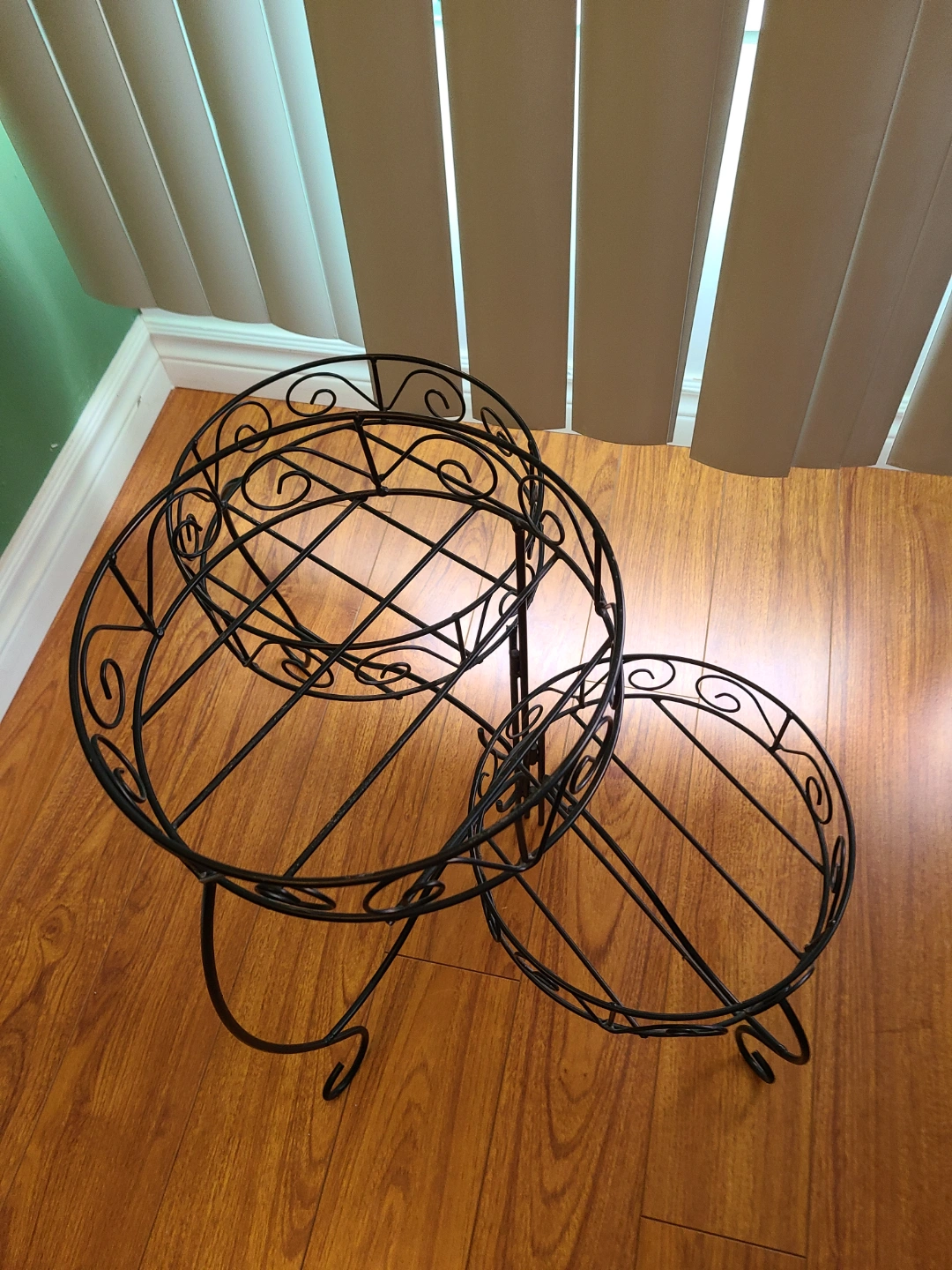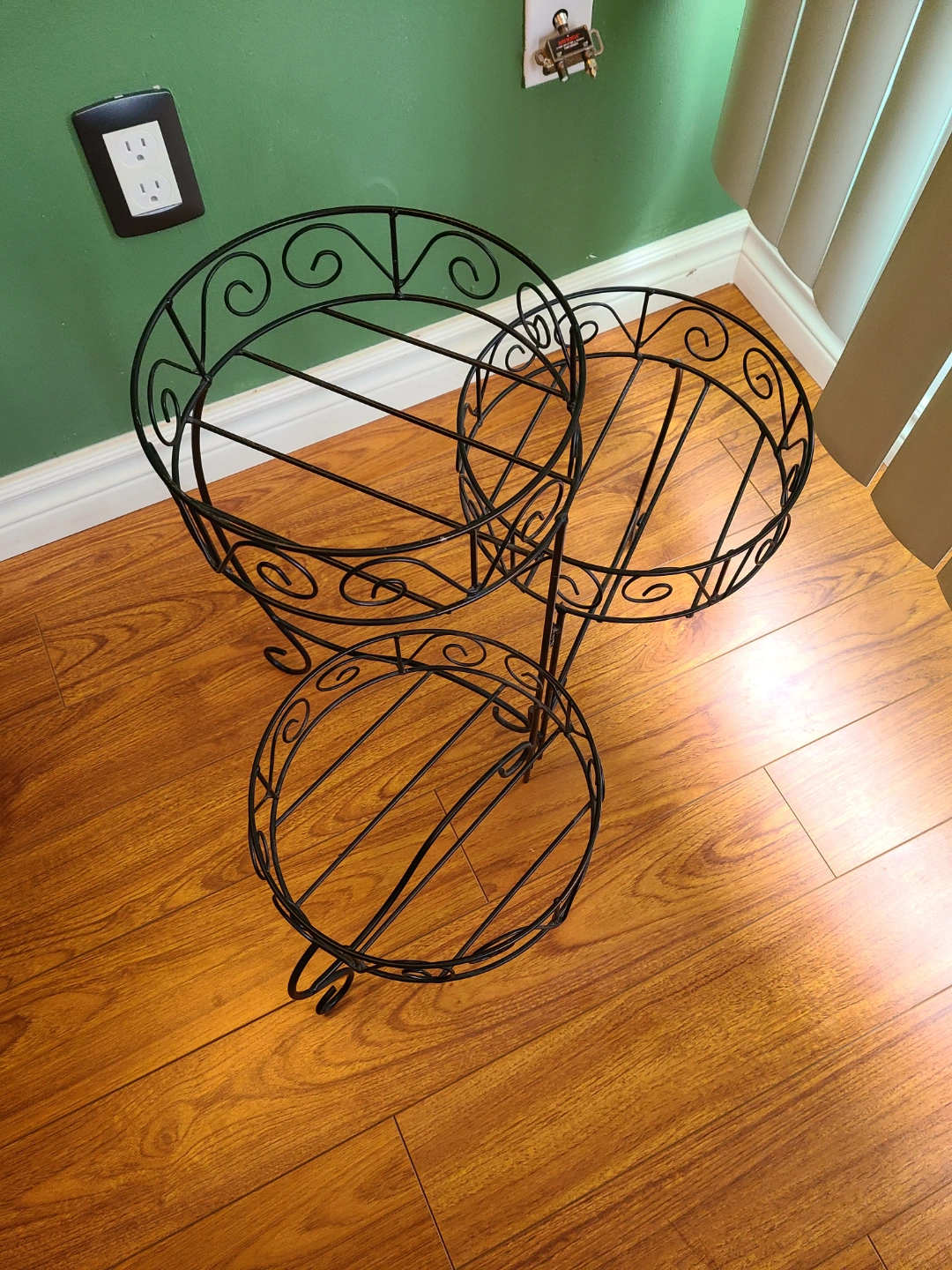 Ornate metal plant stand. Three tiers. Black finish. Great for indoor plants. Could use also as a Cake n pastries display.