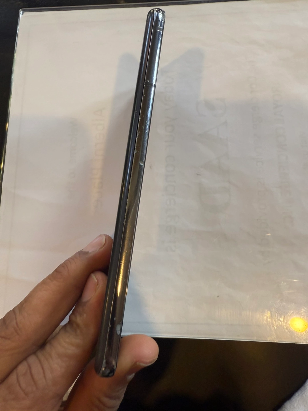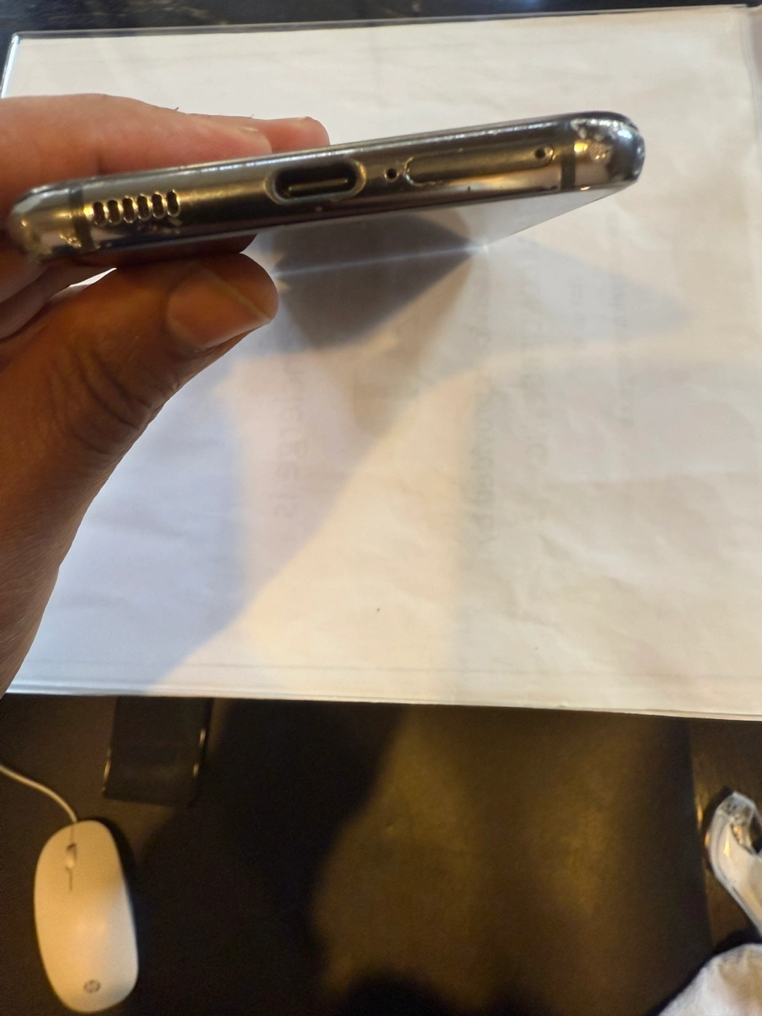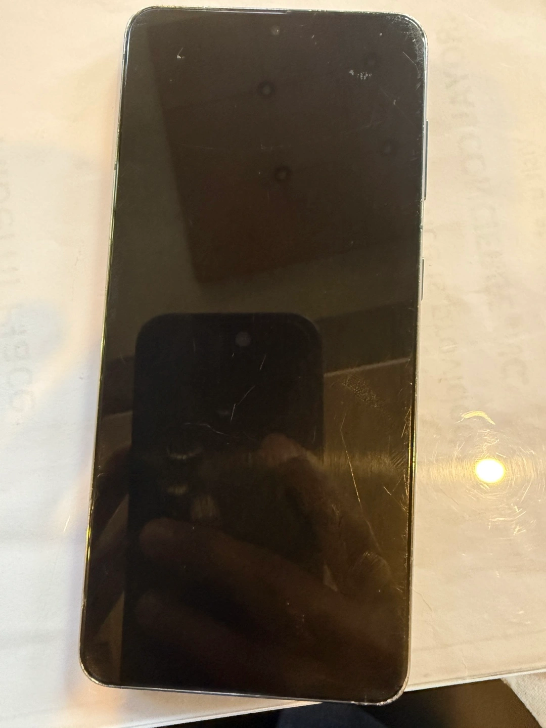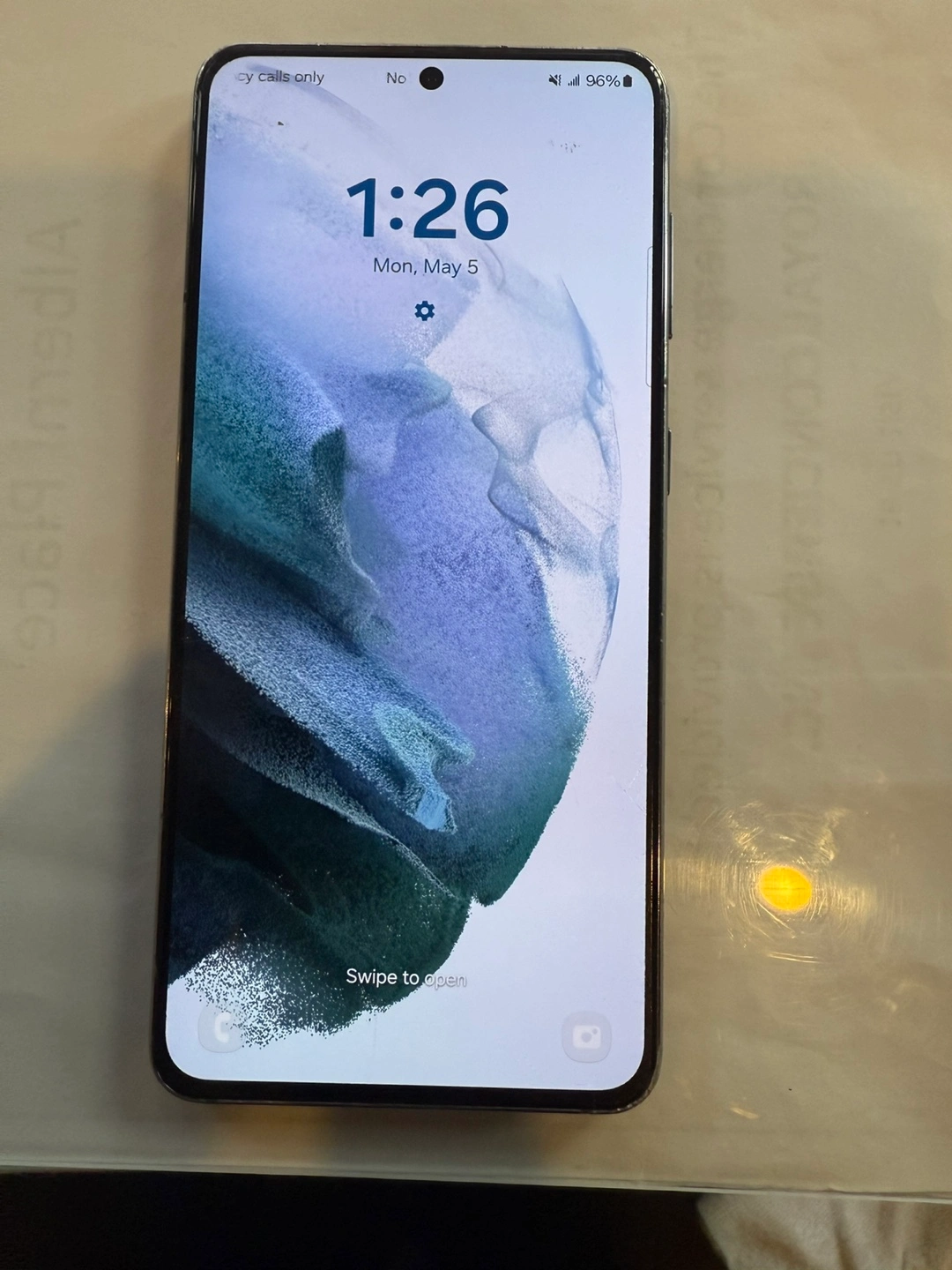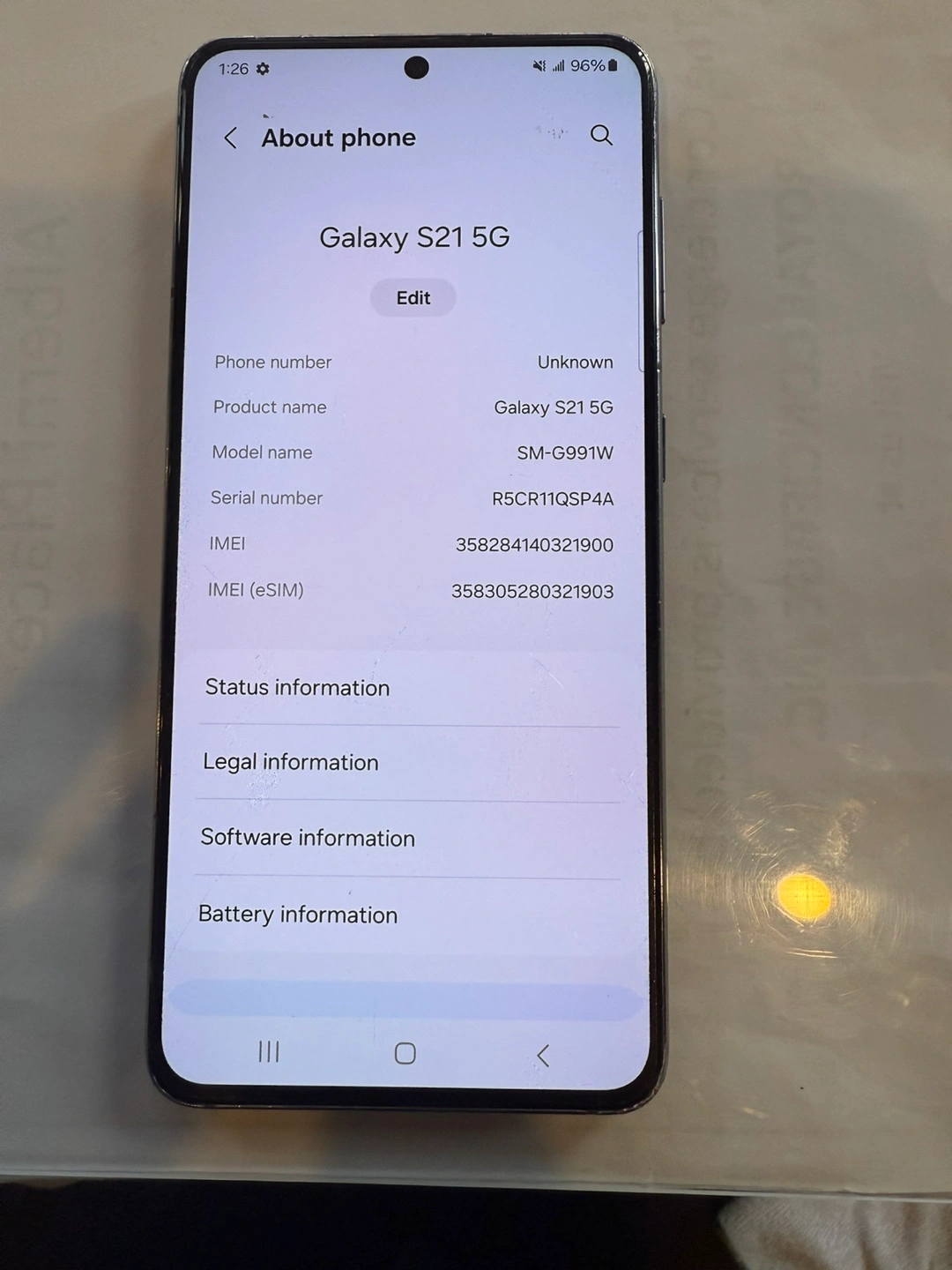 Samsung Galaxy S21 5G smartphone. 128 GB storage. Scratch on screen and side edge no cracks or damage. Great working condition no issues . Includes a charger