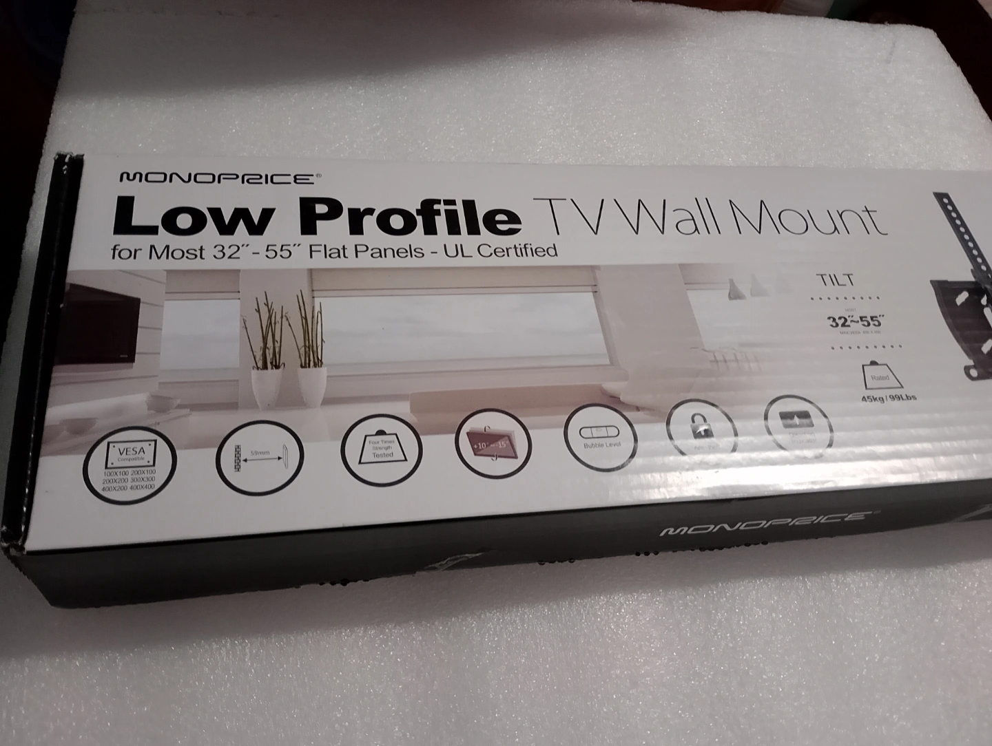 Low profile TV wall mount. Fits 32" to 55" flat panels. UL certified. Includes tilt functionality. Hardware included.