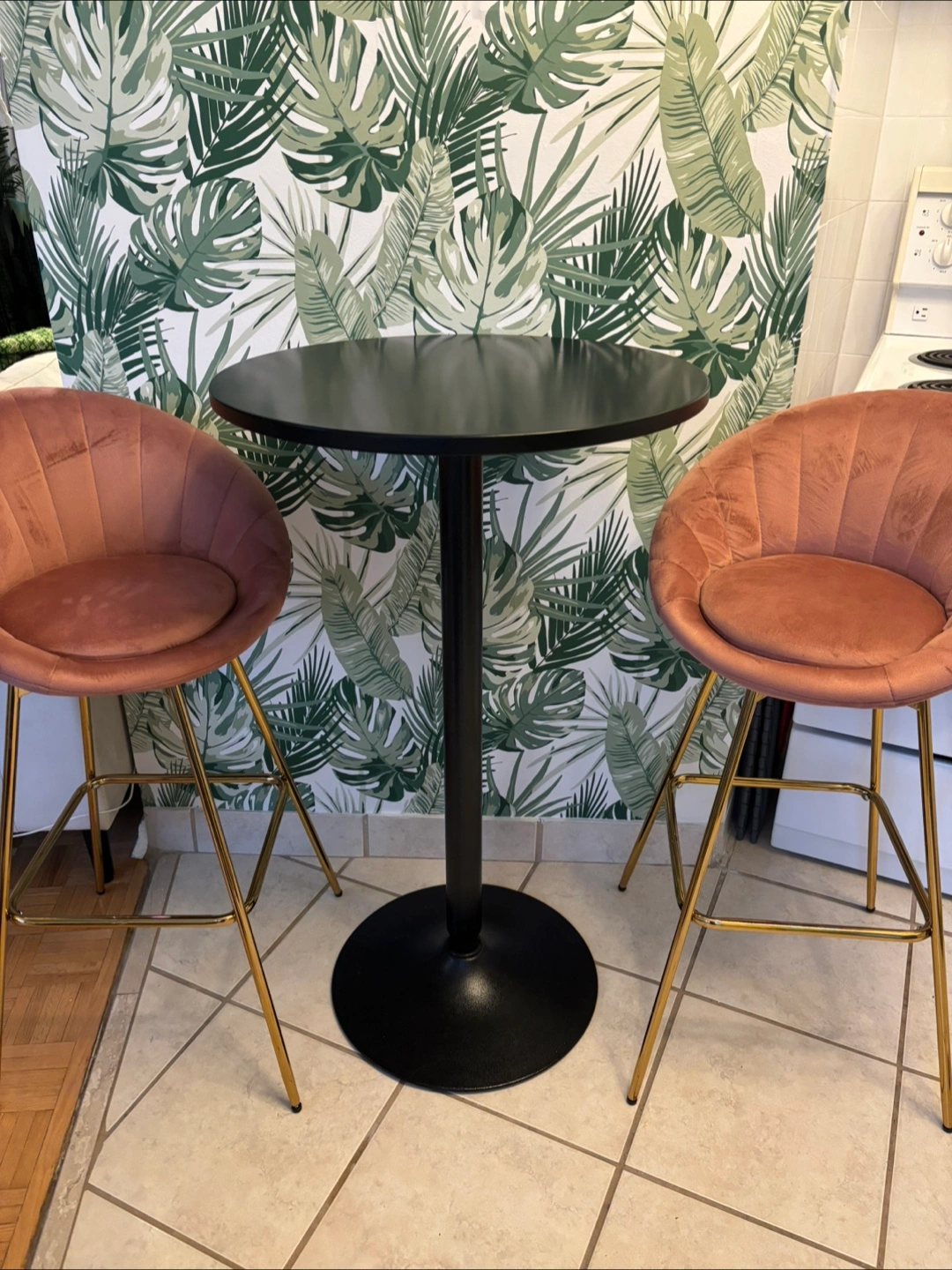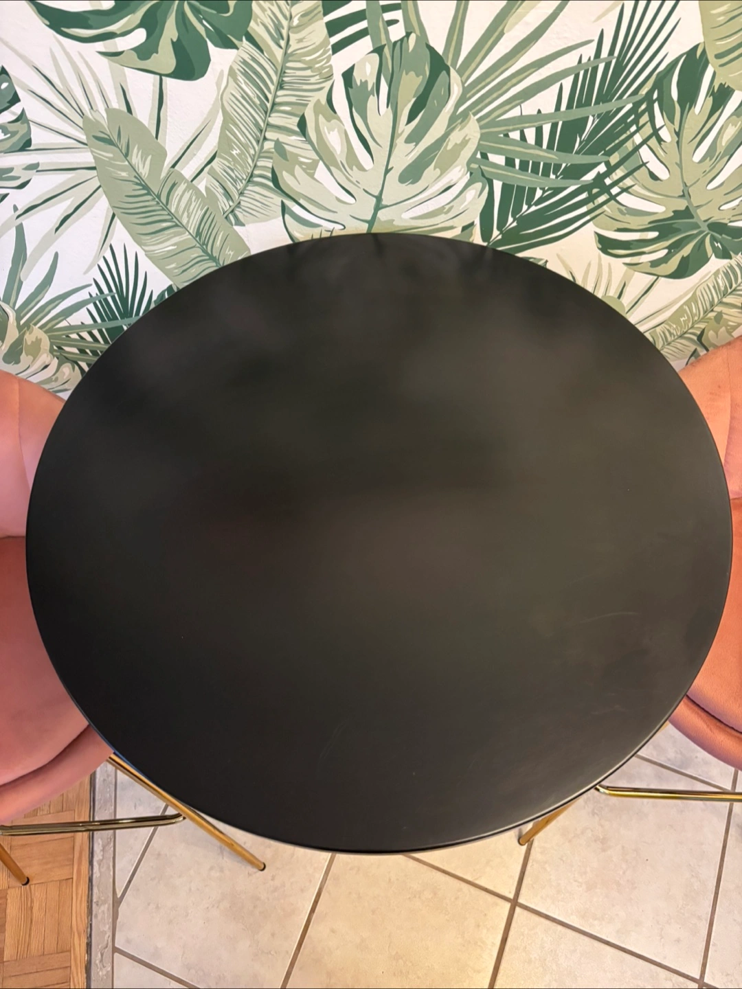 Black round table with a single pedestal base. Perfect for a small space. Measures approximately 23 5/8" diameter. Sturdy metal construction. Comes apart in three pieces (top, base, and middle) for super easy transport.
