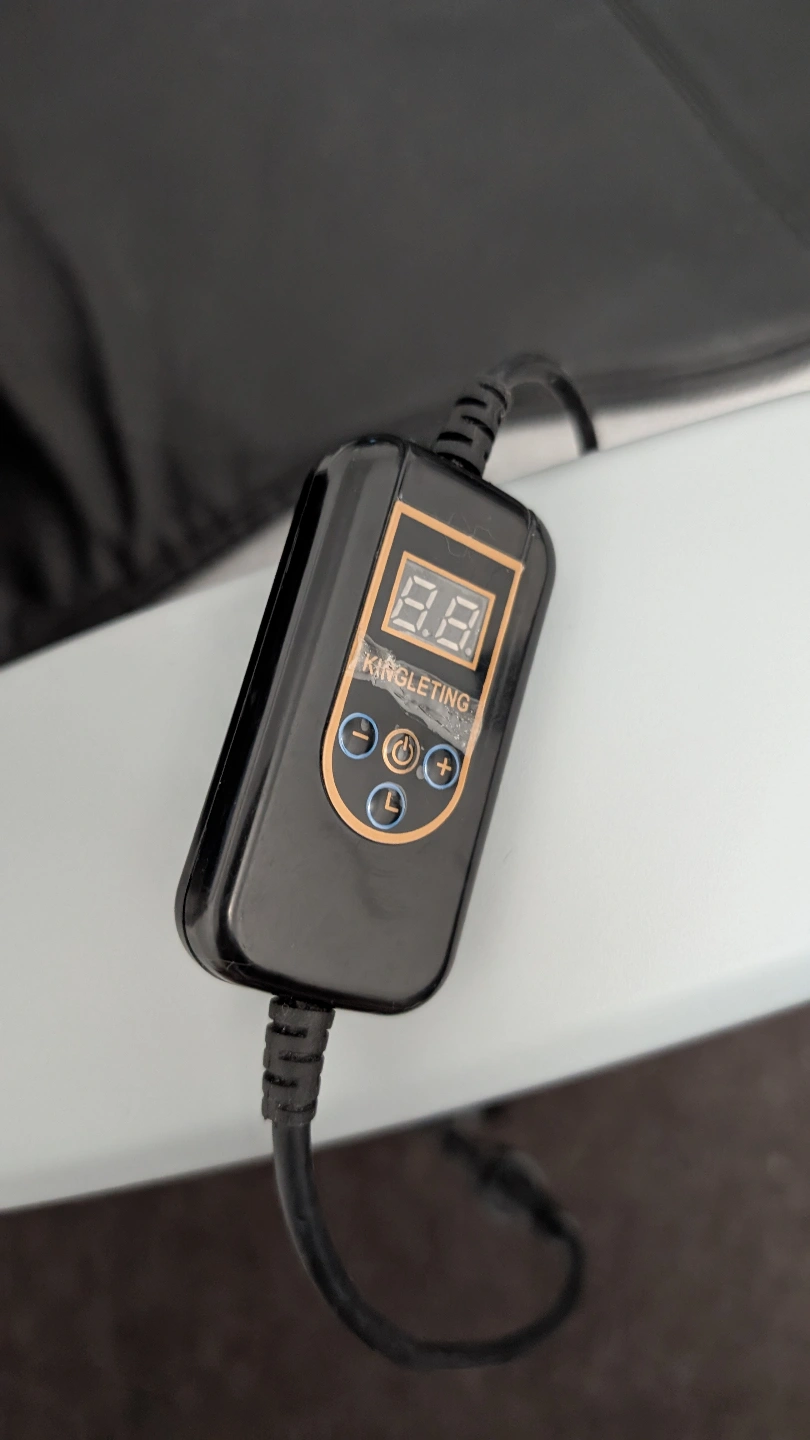 Heated car and chair warmer. Features a digital controller, multiple settings, and includes a car adapter. Attaches easily to most chairs.