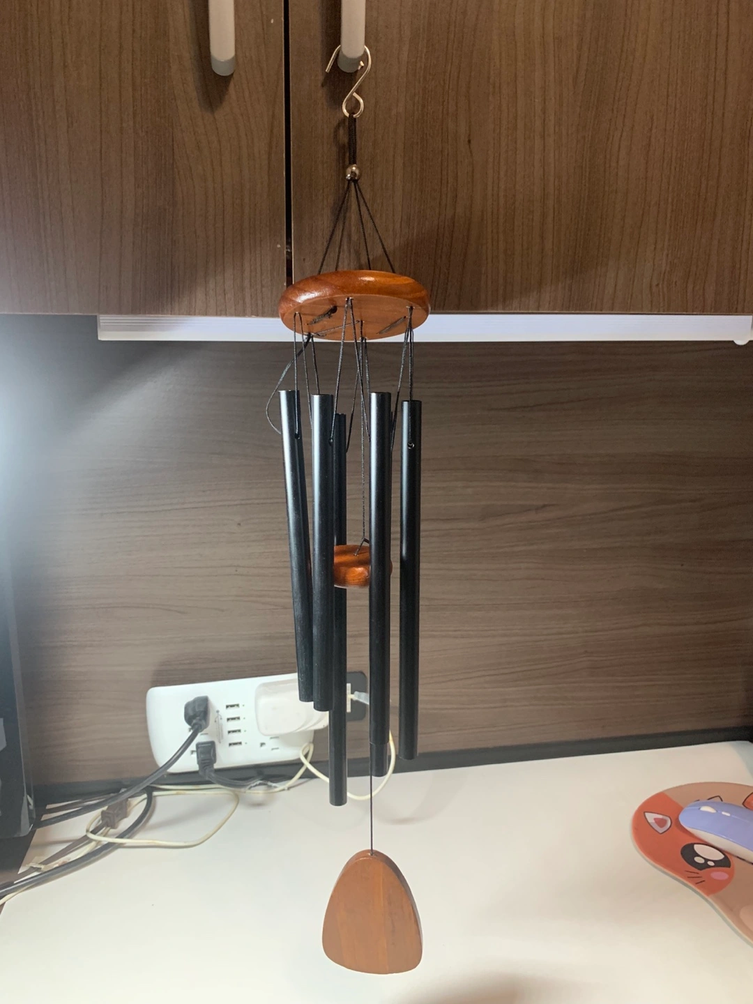 Small wind chime. Features black metal tubes and wooden accents. Hangs from a small hook.