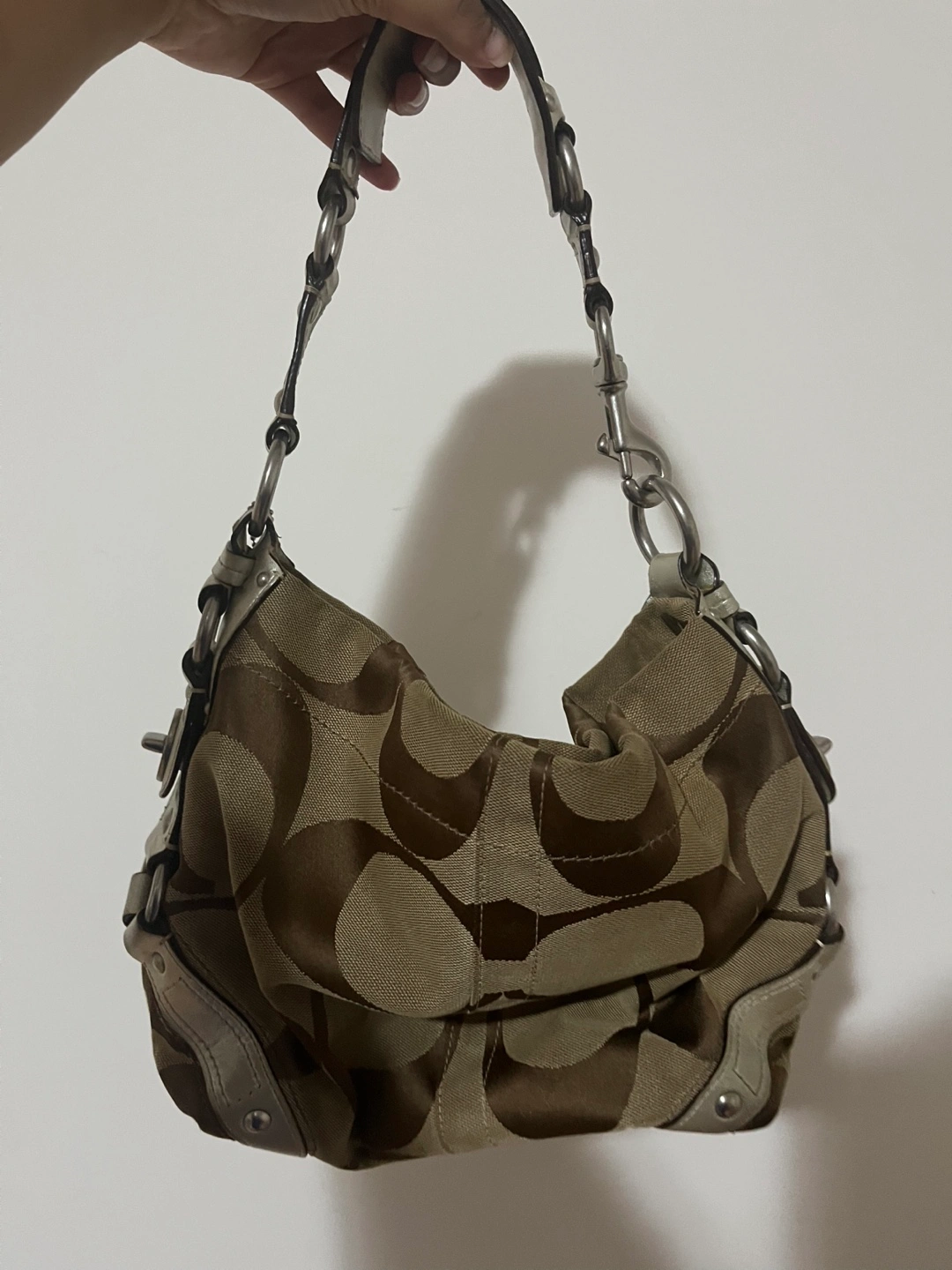 Pre-owned Coach handbag. Tan signature canvas. Silver-tone hardware. Shoulder strap. Interior pocket. Good condition.