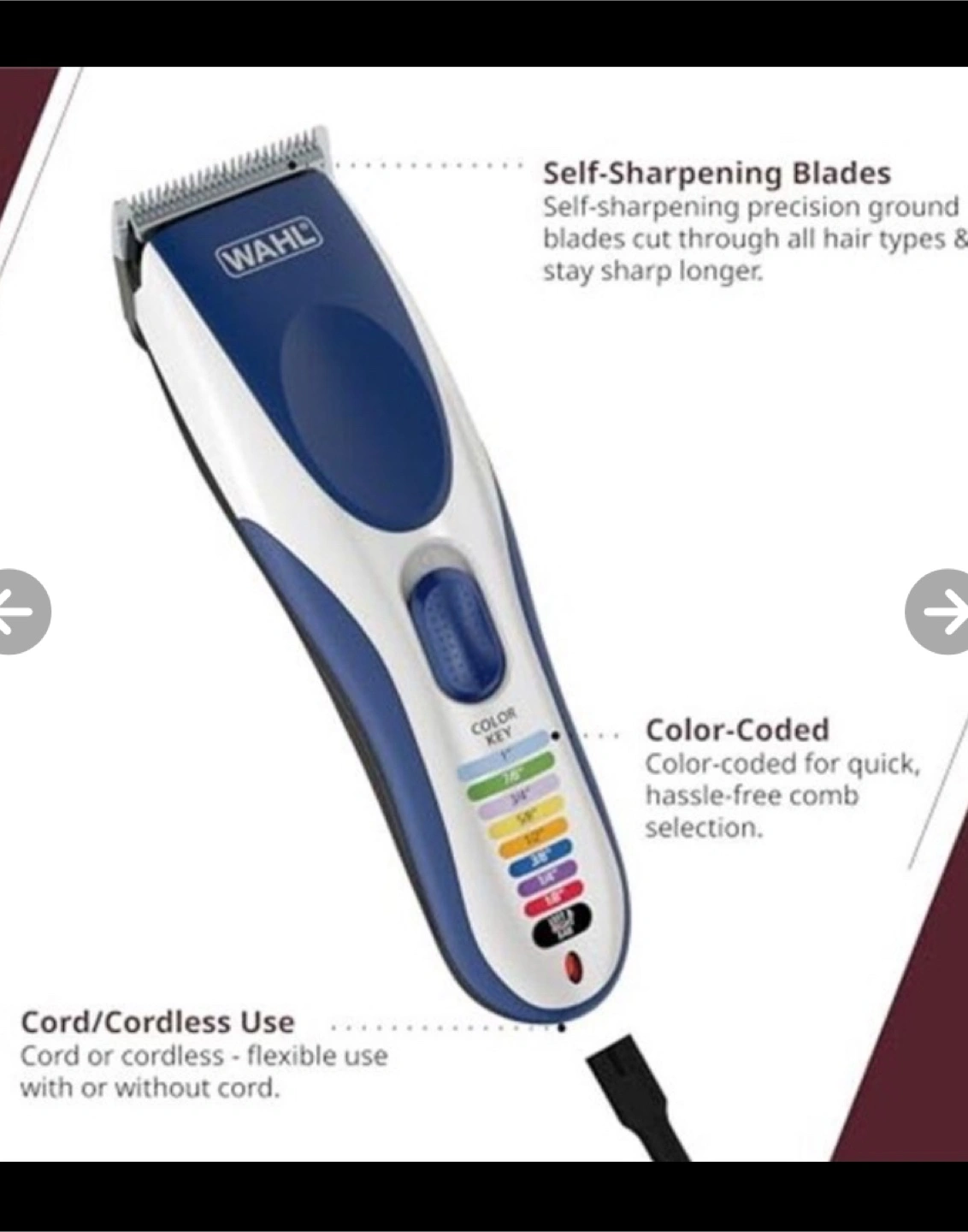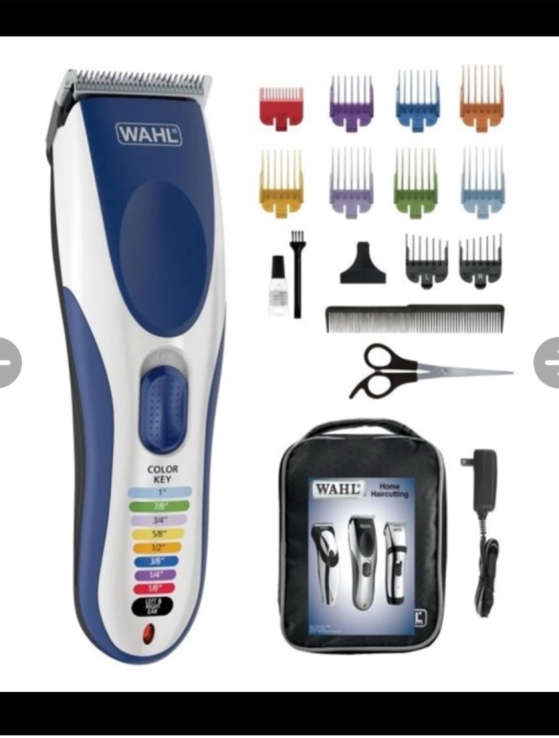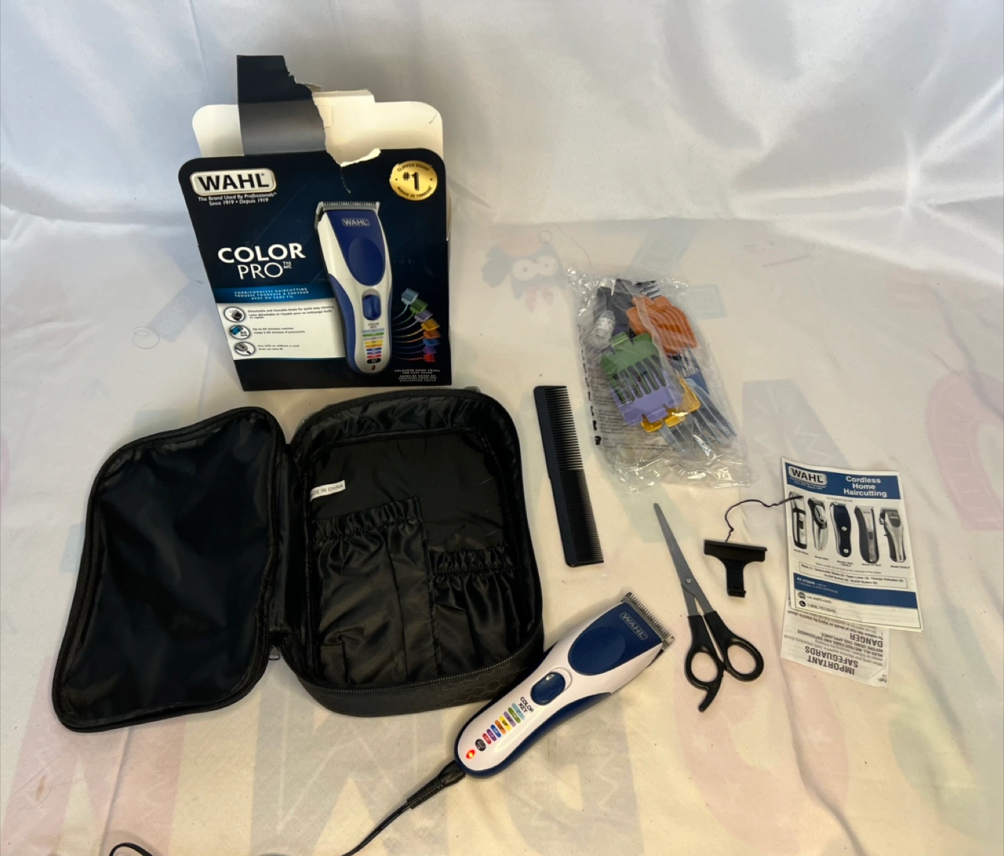 Wahl Color Pro hair clipper. Cordless and corded use. Includes multiple combs, scissors, carrying case, and oil. Self-sharpening blades.