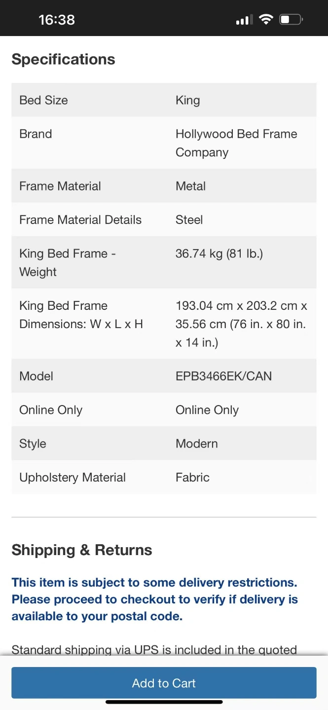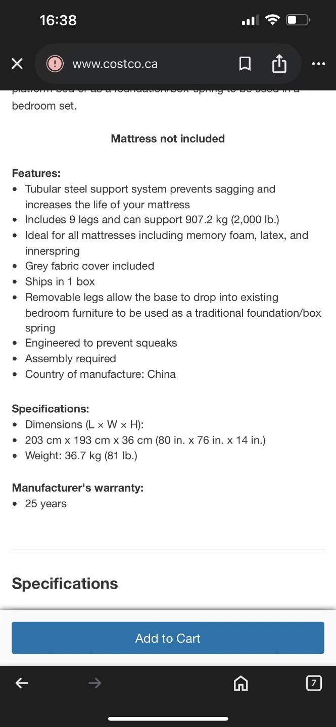 King size platform bed base in excellent condition purchased from Costco. Easy assembly steel mattress foundation. Well made and extremely sturdy. Includes grey fabric cover. Quick and easy setup. Mattress not included. Pickup only.