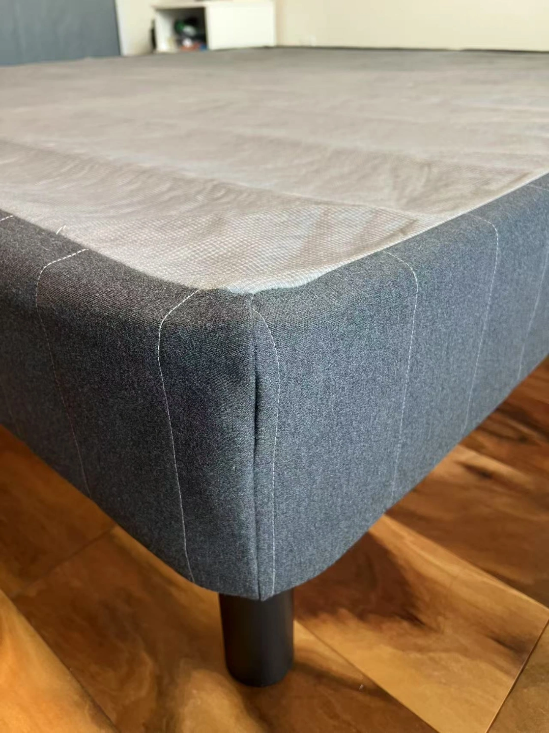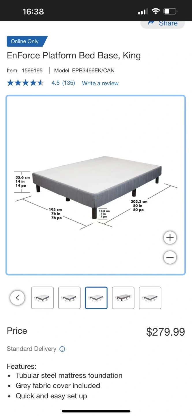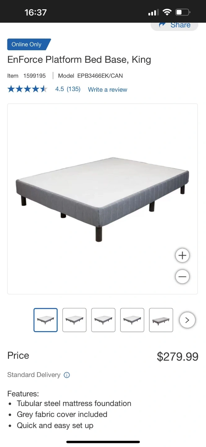 King size platform bed base in excellent condition purchased from Costco. Easy assembly steel mattress foundation. Well made and extremely sturdy. Includes grey fabric cover. Quick and easy setup. Mattress not included. Pickup only.