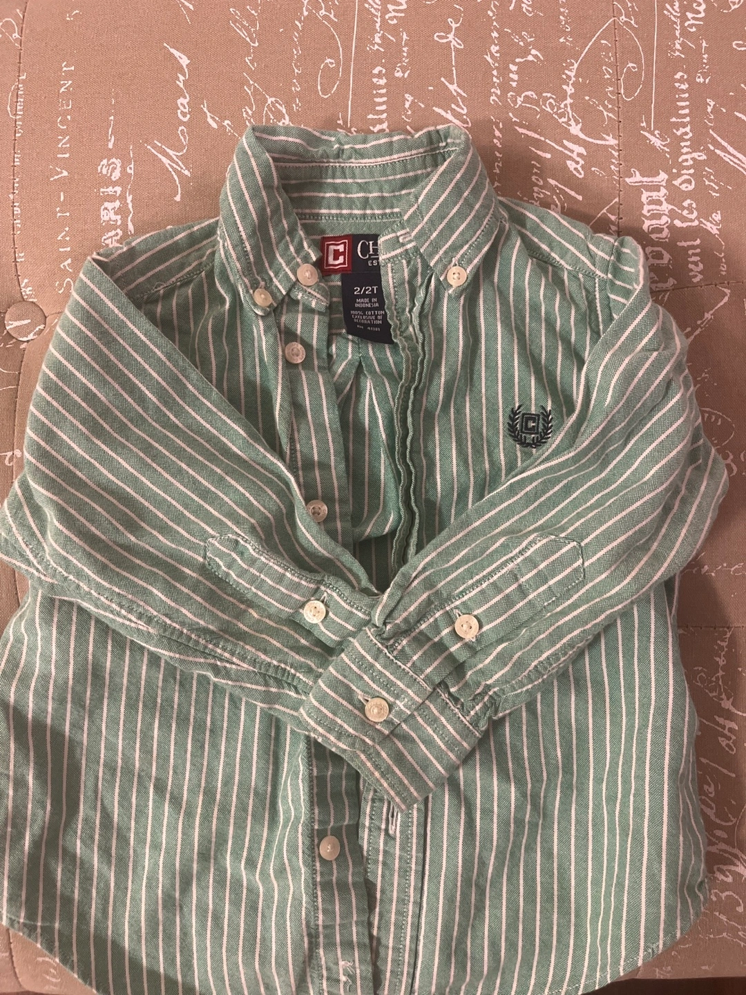 Adorable green and white striped button-down shirt. Long sleeves, collared. Size 2/2T. Great for a casual or dressy look.