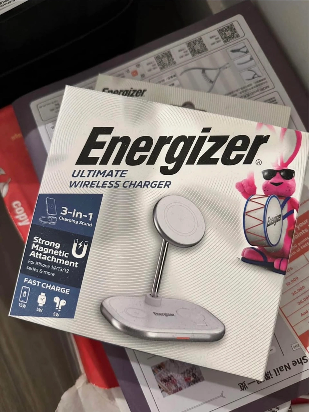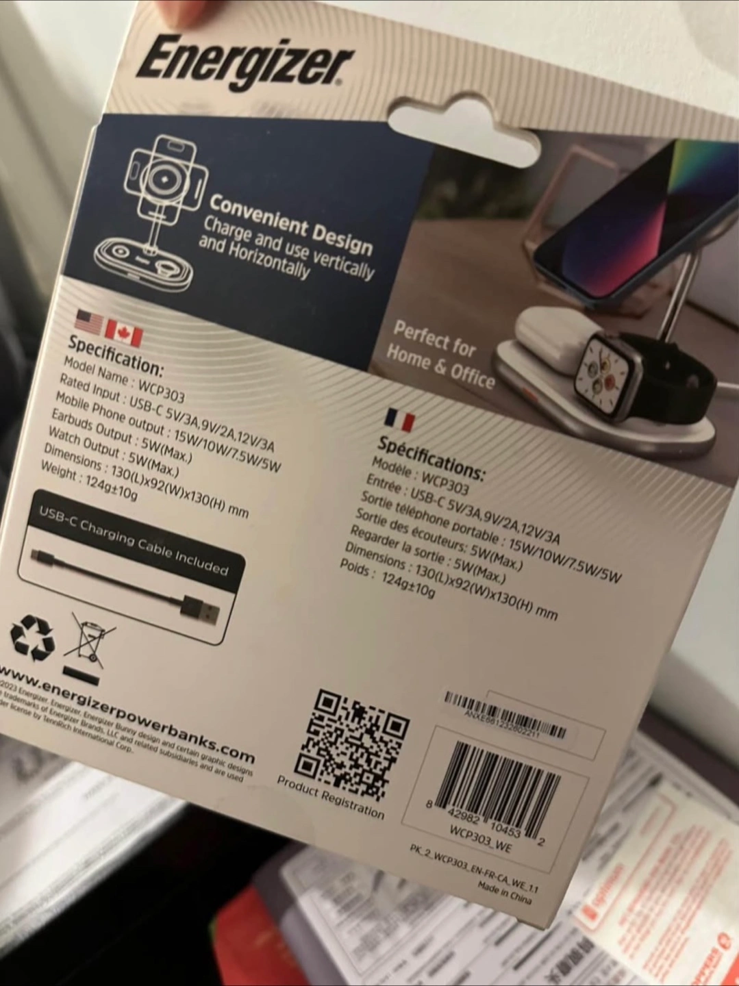 Wireless charging stand. Charges phones, Apple Watches, and AirPods. Fast charging. Includes USB-C charging cable. Model WCP303.