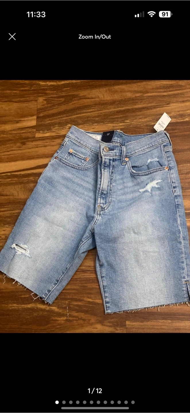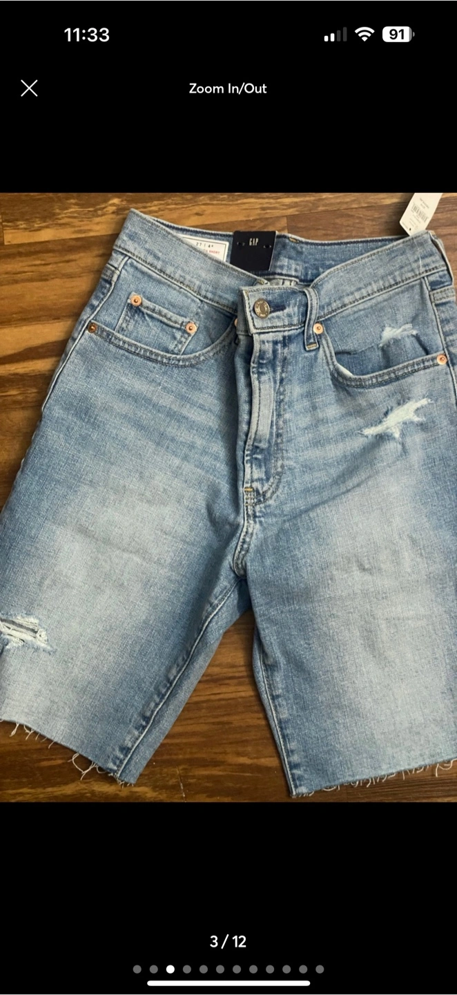 Light wash denim shorts. Size 27. Distressed details. Raw hem.