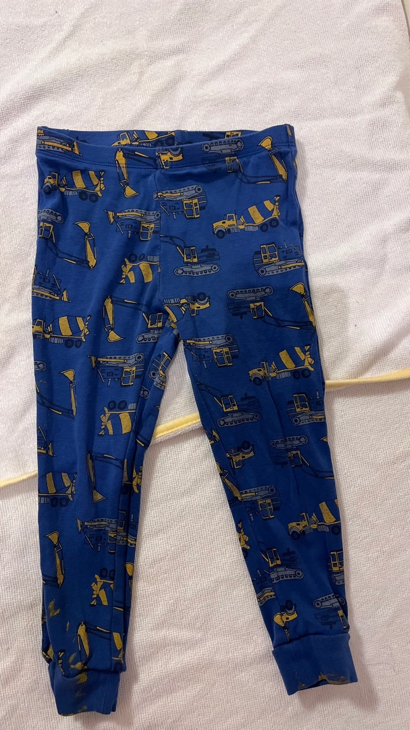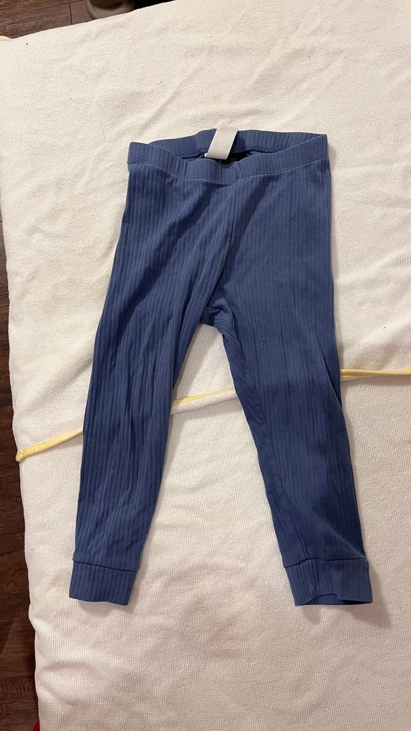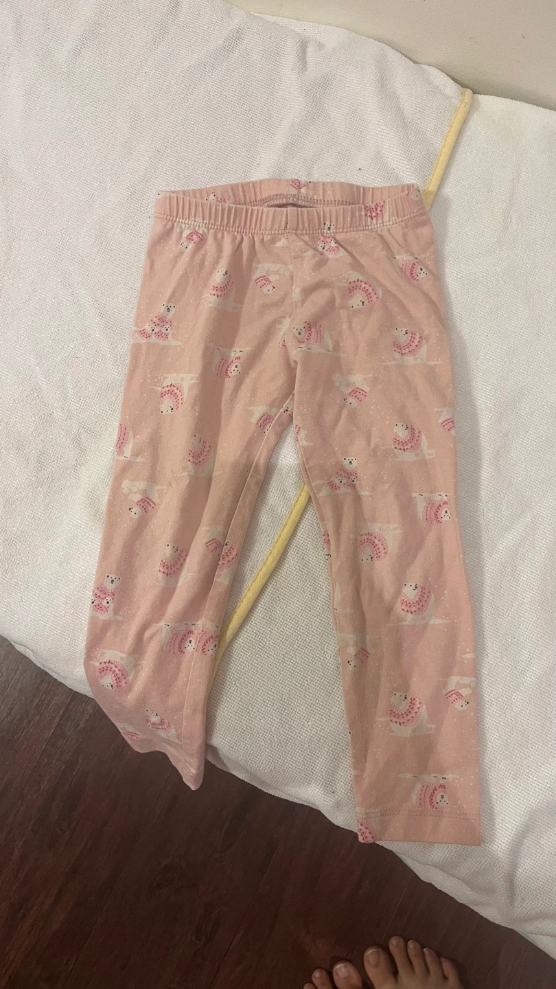 Bundle of four pairs of toddler girls leggings. Includes one pair of construction vehicle print leggings, one pair of black leggings, one pair of ribbed blue leggings, and one pair of pink polar bear leggings. Sizes vary slightly. The price included-includes all of them.