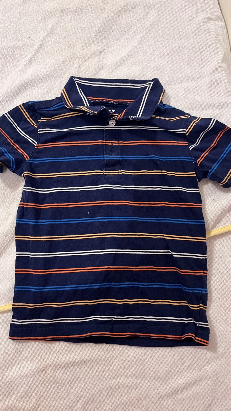 Adorable horizontally striped polo shirt. Short sleeves. Navy blue base colour with orange, white and blue stripes.