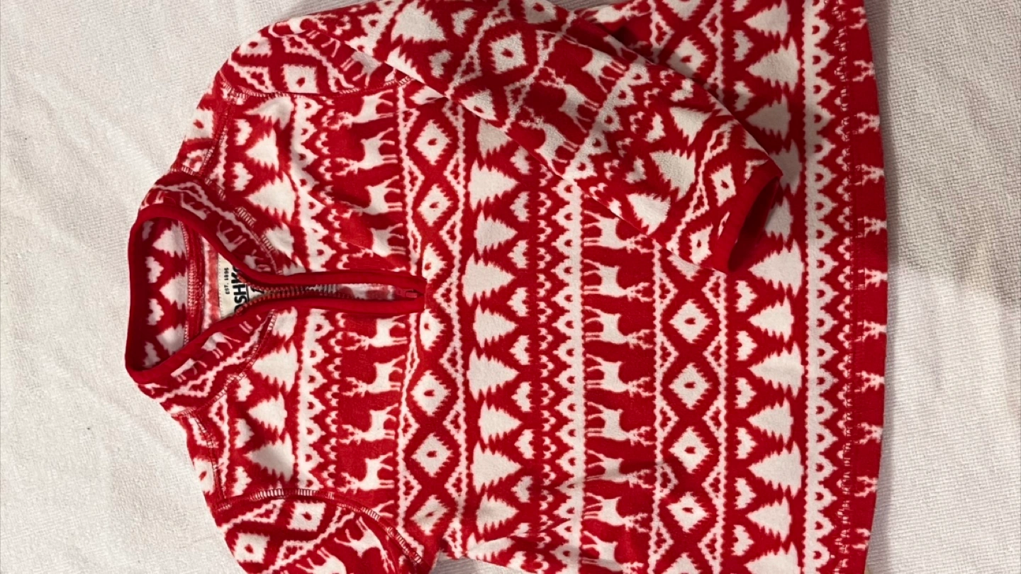 Festive red and white fleece pullover. Half zip closure. Long sleeves. Cozy and warm. Christmas pattern.