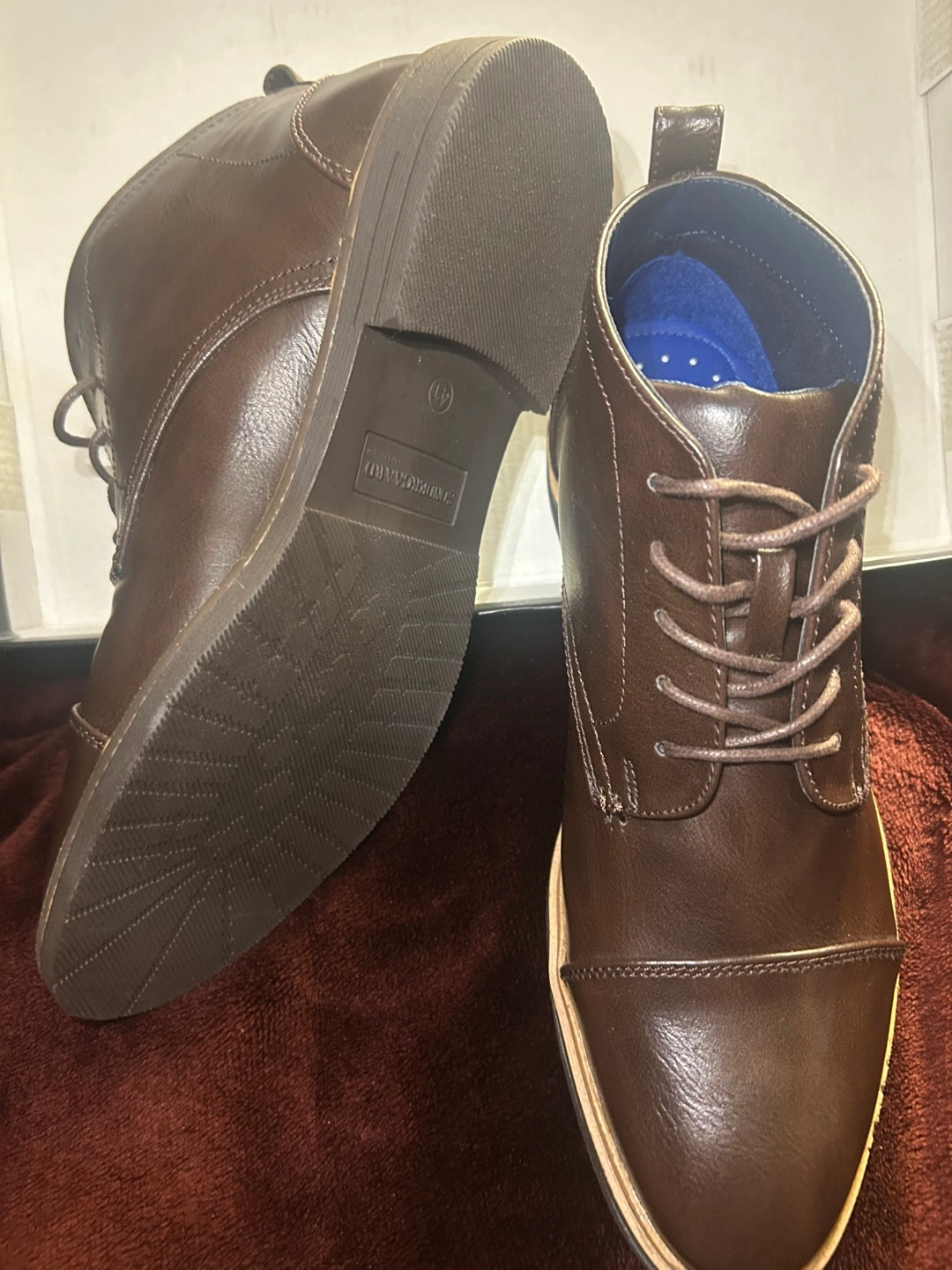 Brown leather ankle boots. Lace-up closure. Cap toe design. Cream coloured sole. Excellent condition. New in box. Size 41.