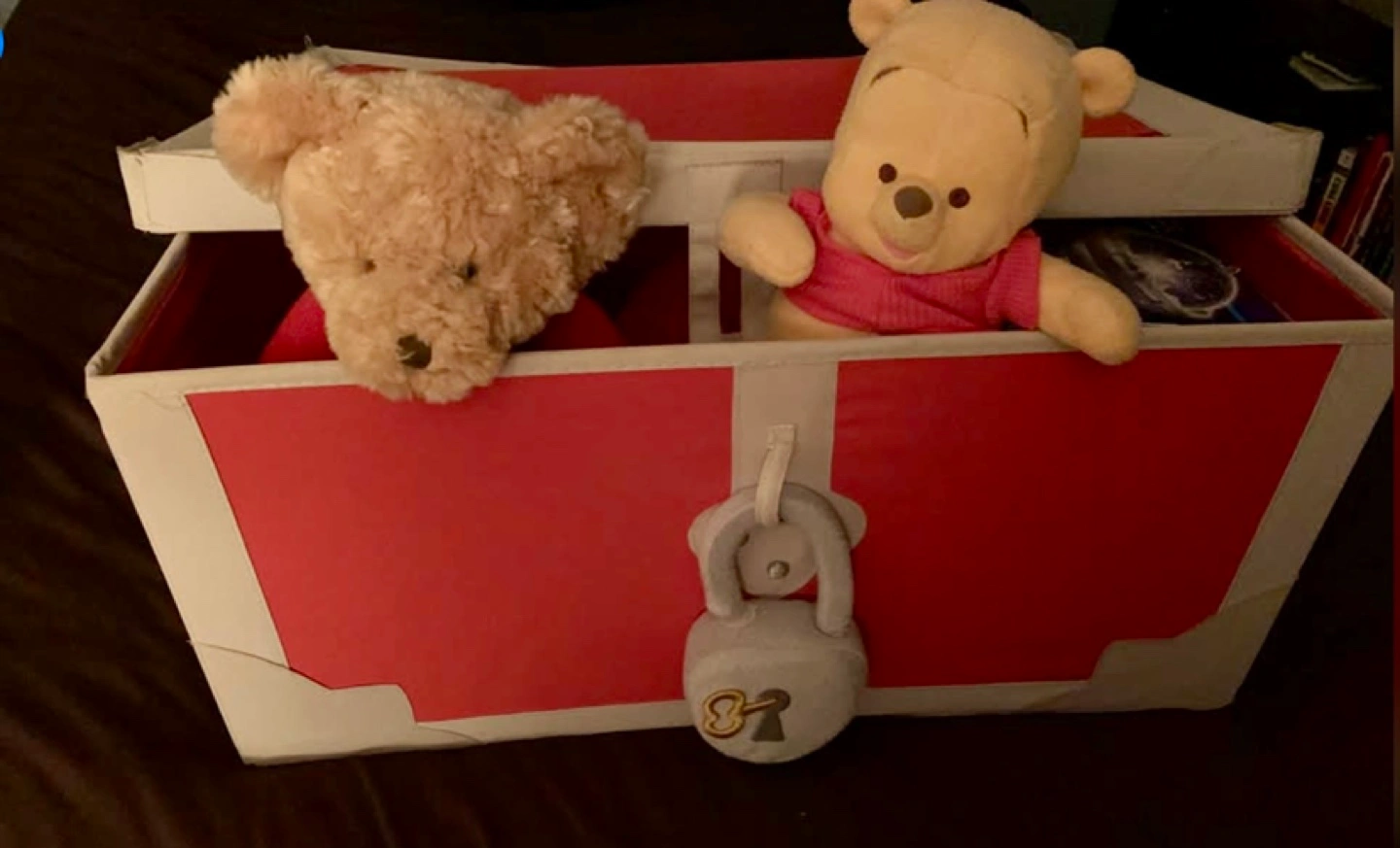 Soft-sided toy box from that Swedish retailer, measures 24x15x11 inches with felt "lock." Lightweight, works well with stuffies and other lighter items. $5 (does not include stuffies).