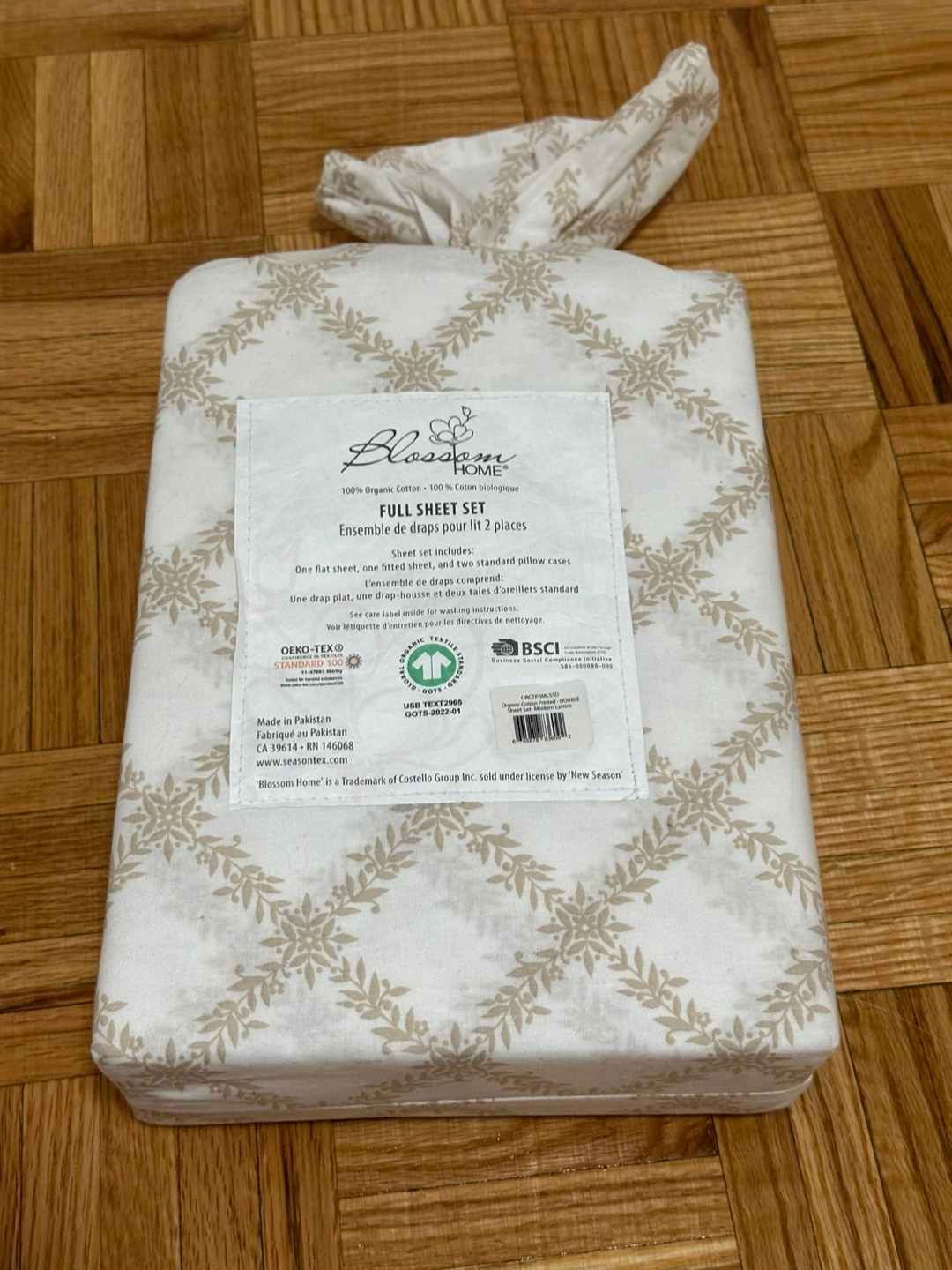 15Never used, still fresh and ready for a cozy bed! This double size bedsheet set is made from 100% organic cotton – super soft, breathable, and gentle on skin. Set includes: * 1 Fitted Sheet * 1 Flat Sheet * 2 Standard Pillowcases Highlights: * Double size (full bed) * Pure organic cotton – eco-friendly & comfy * Neutral color to suit any room (message for pics!) * From a smoke-free, pet-free home Asking $45 – great value for organic cotton! Pickup or meet-up available. First come, first served!