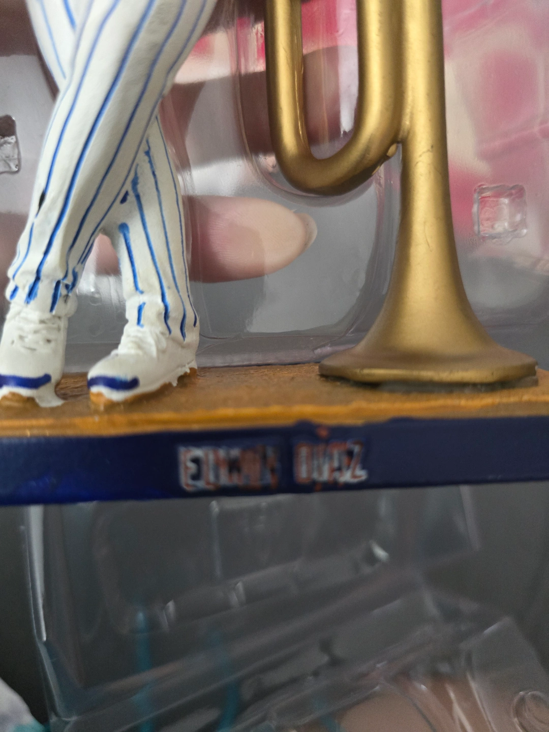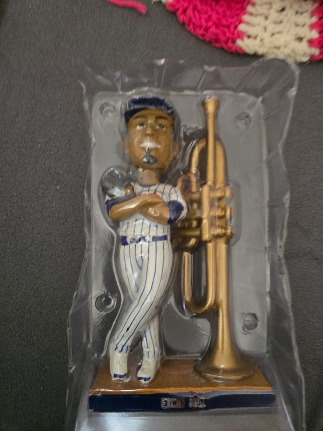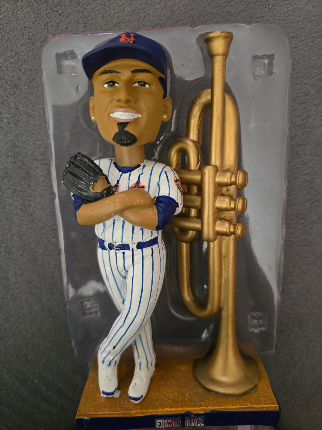 1000+Collectible Erick Diaz bobblehead figurine. Baseball player in Mets uniform. Features a gold trumpet. New York Mets branding visible. *Has no Box*