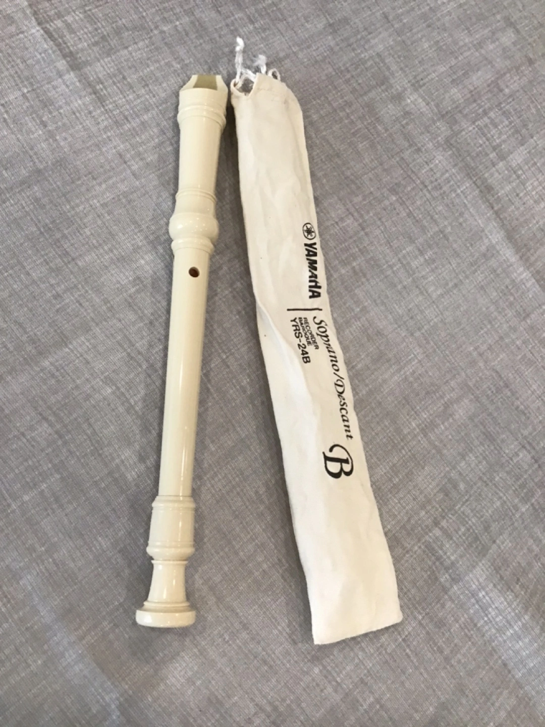 Yamaha soprano descant recorder. Off-white plastic. Comes with a soft cloth carrying case.