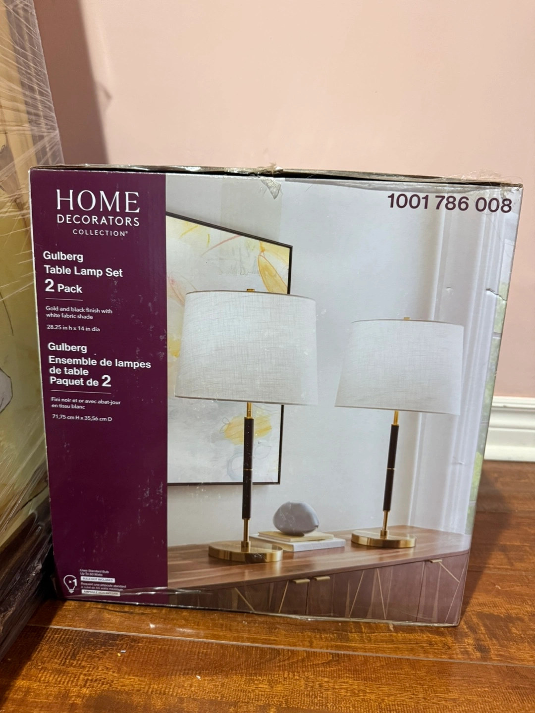 New in box. Gold and black finish table lamps with white fabric shades. Set of two. Selling 1 but would be open to selling the other one if interested.