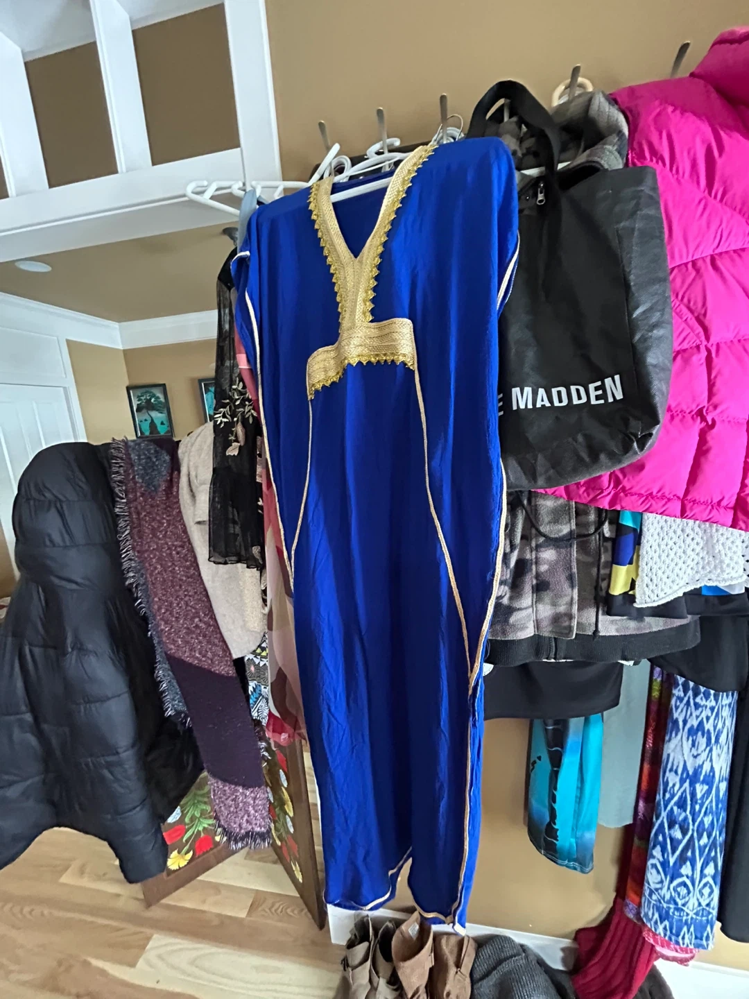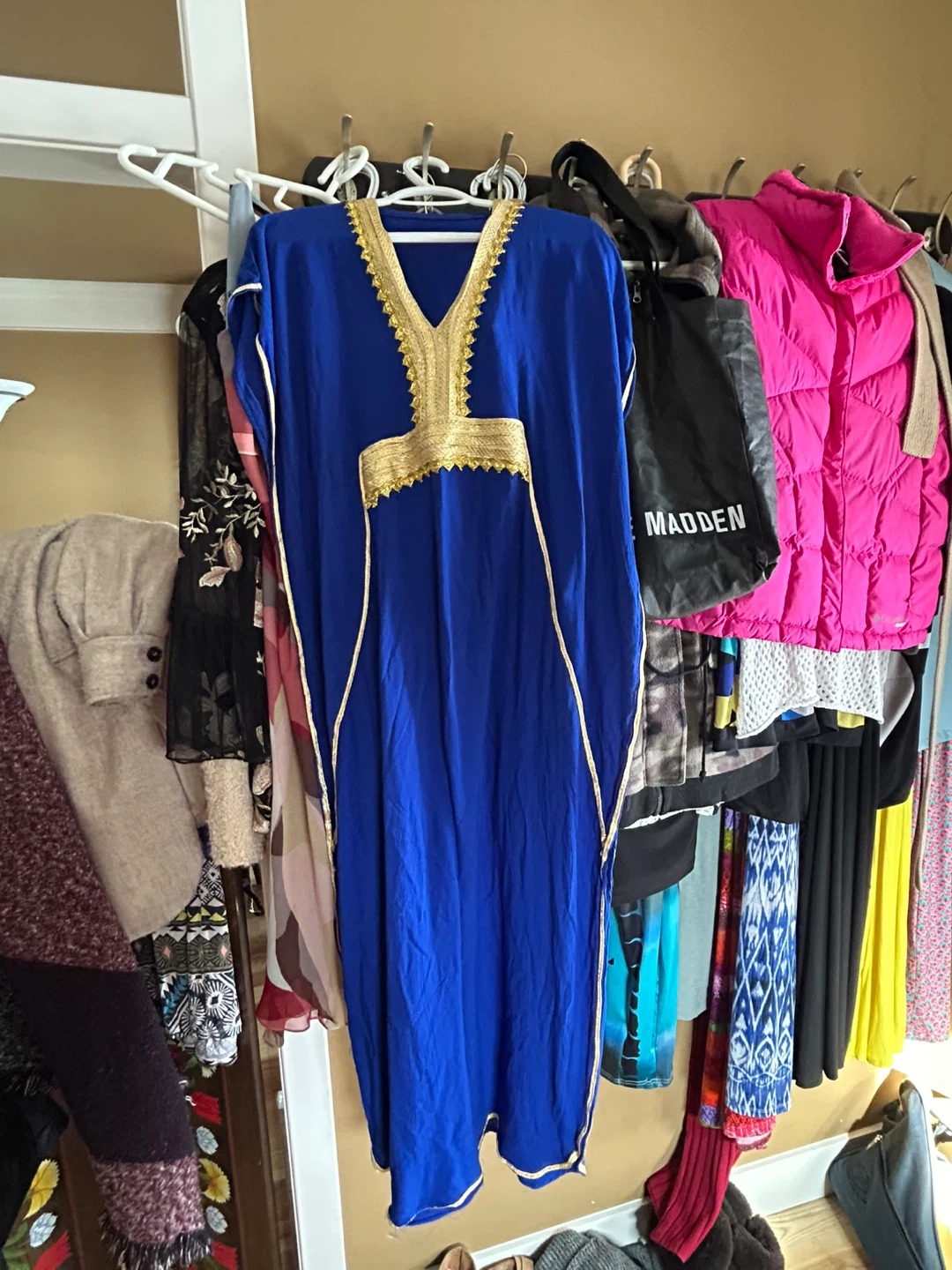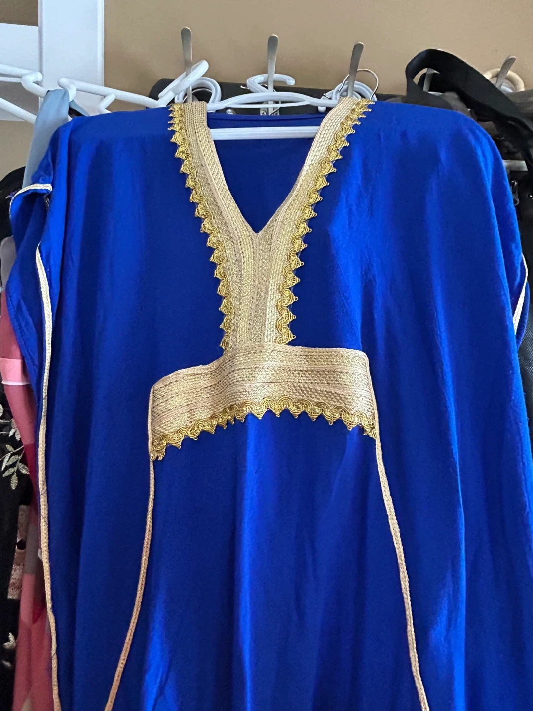 This is a beautiful royal blue kaftan. It features intricate gold trim around the neckline and down the sides. It's a loose, flowing garment perfect for warm weather.