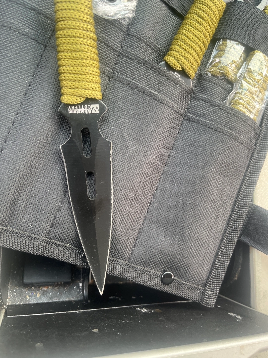 Set of throwing knives. Includes carrying case. Olive green paracord handles. Black blades. Scarborough pick up