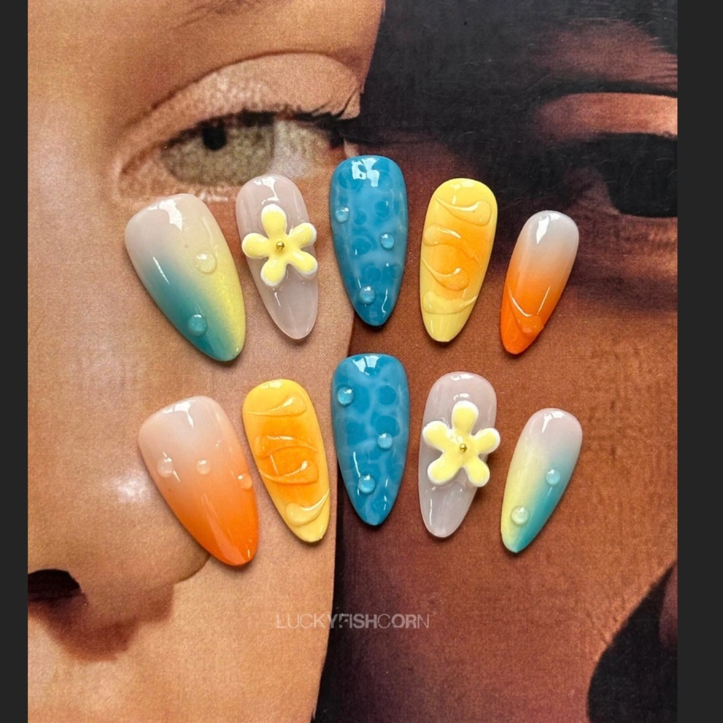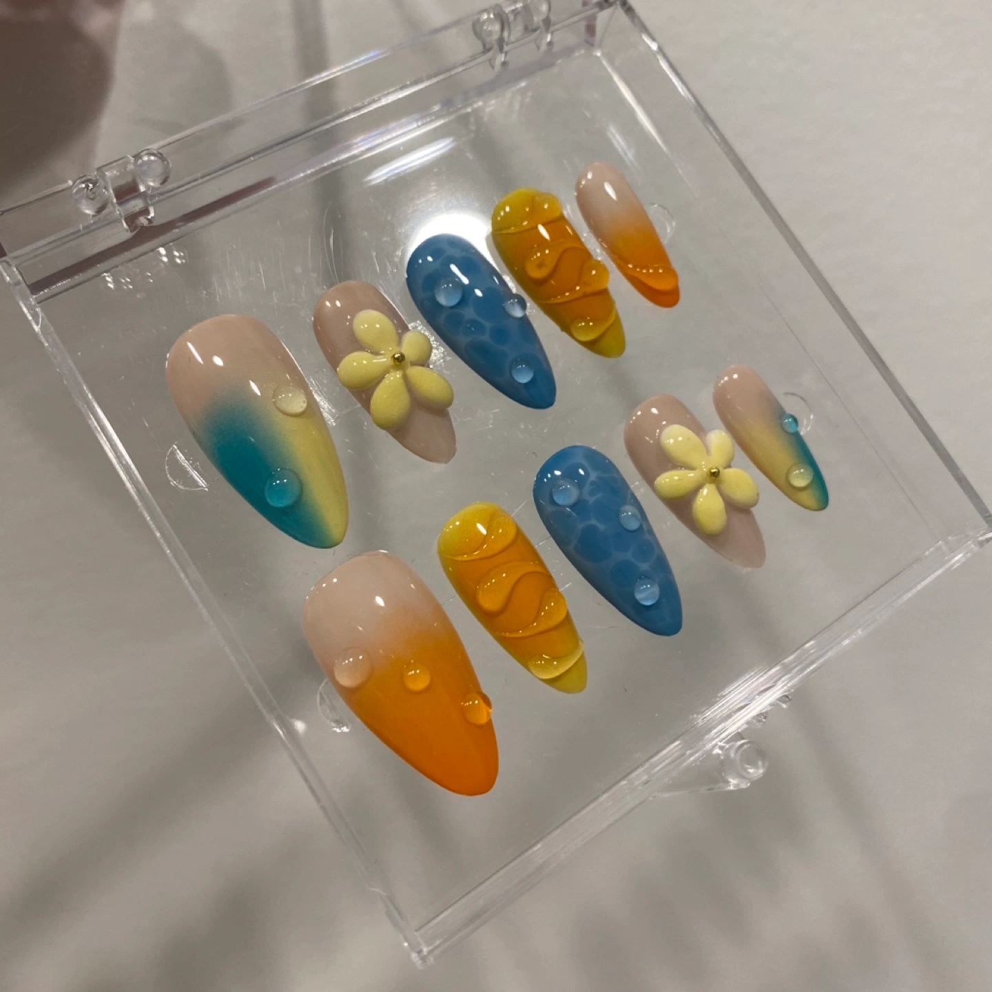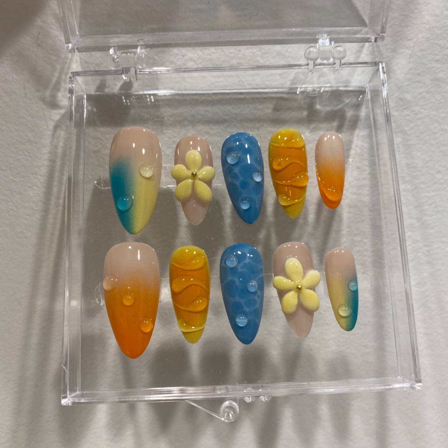 BRAND NEW high-quality handmade press-on nails. Set of ten press-on nails. Features ombre colours, floral accents, and water droplet design. Comes in a clear plastic case. Perfect for a summery look!