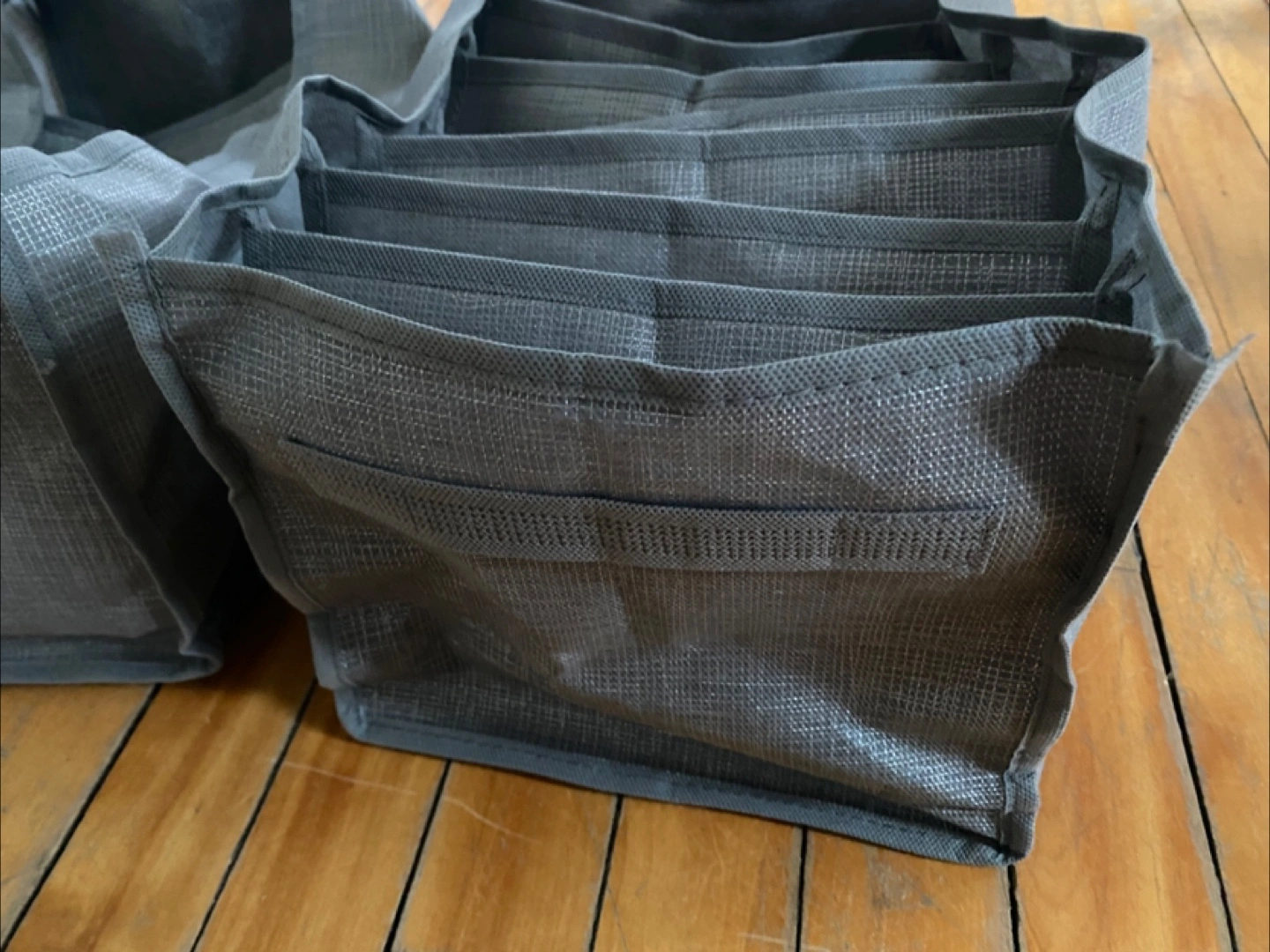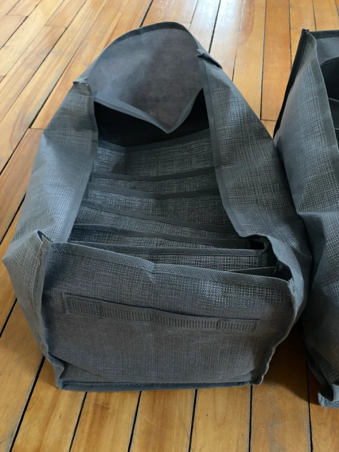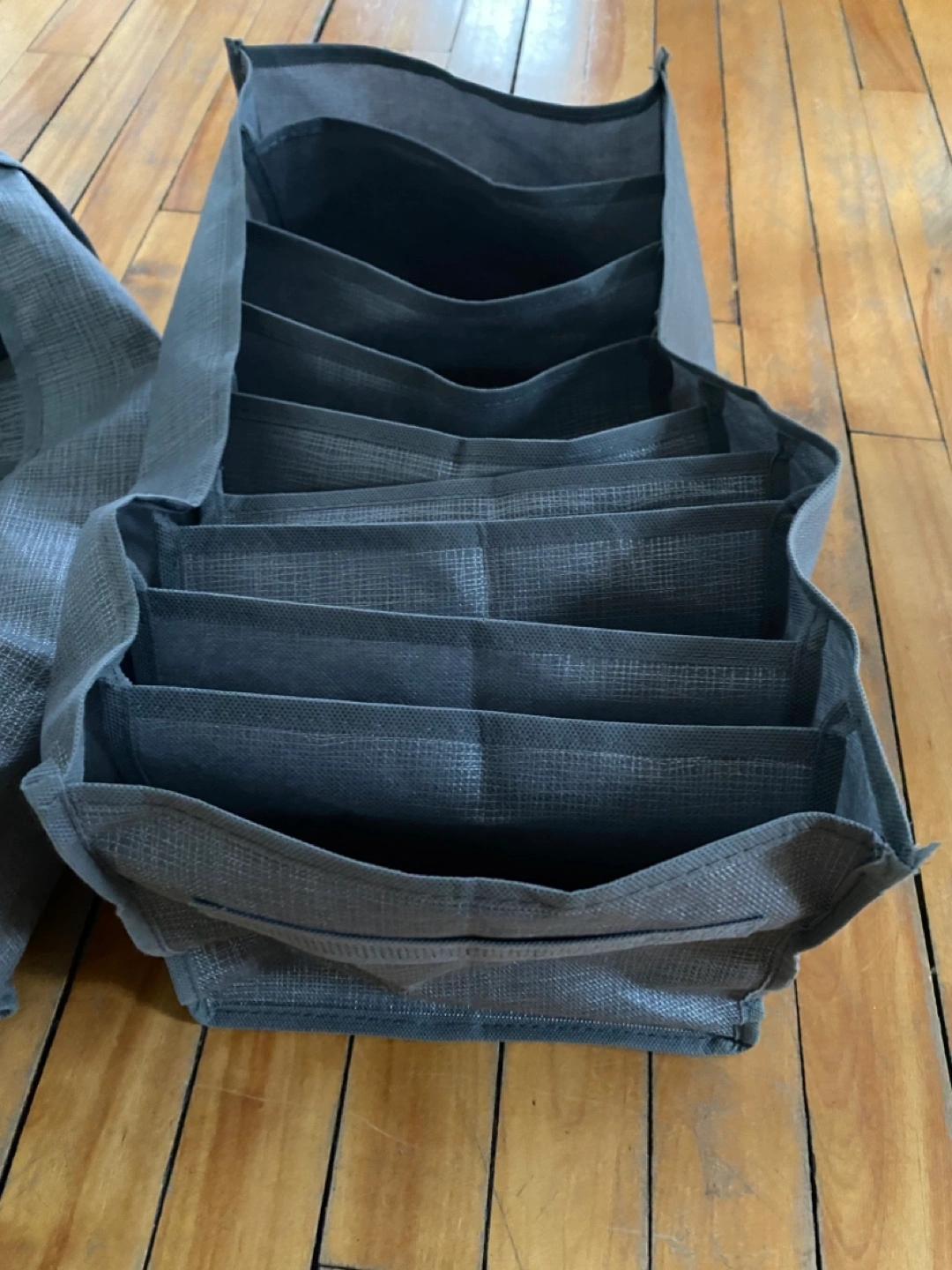 Two grey fabric drawer organizers.