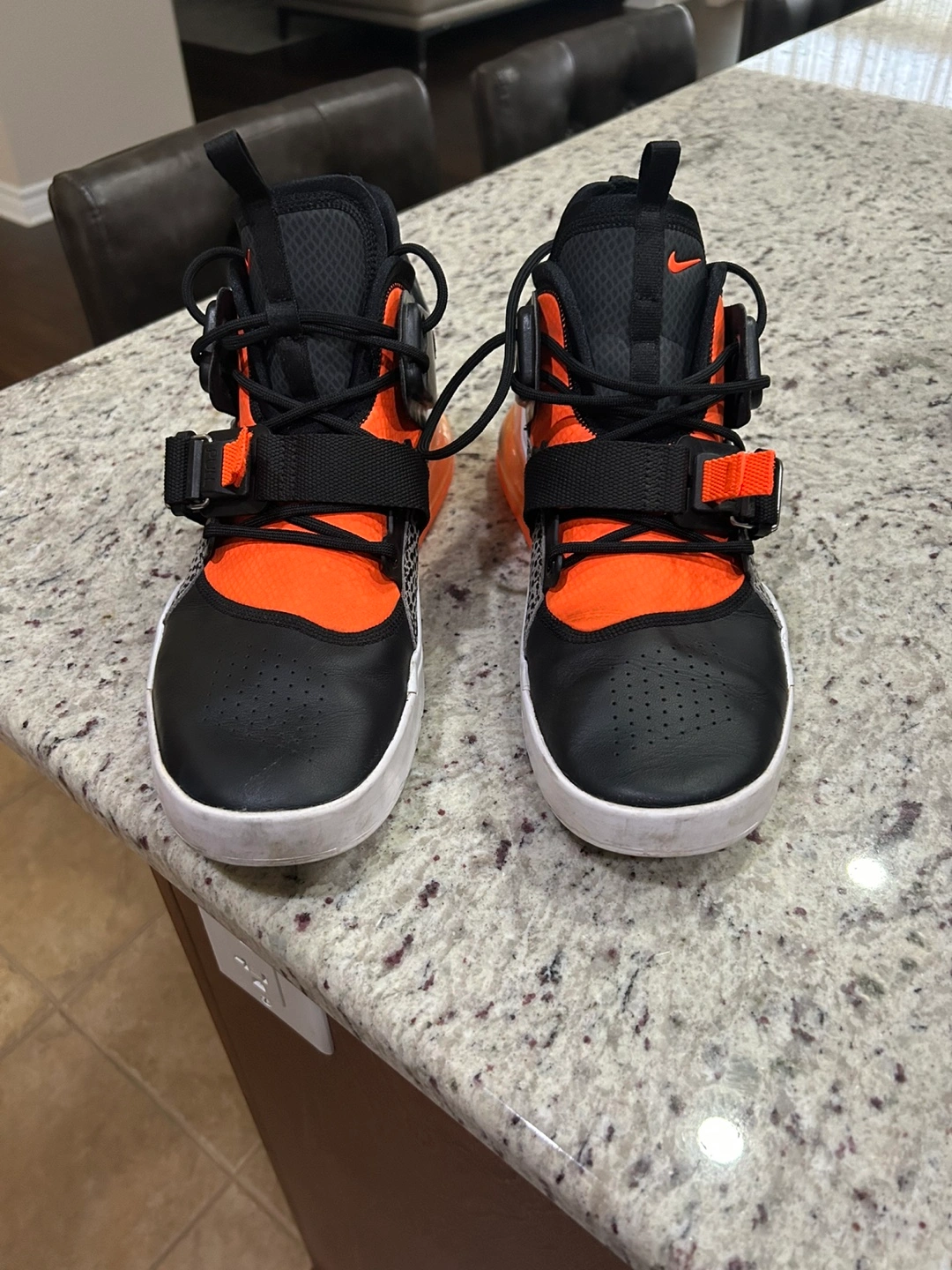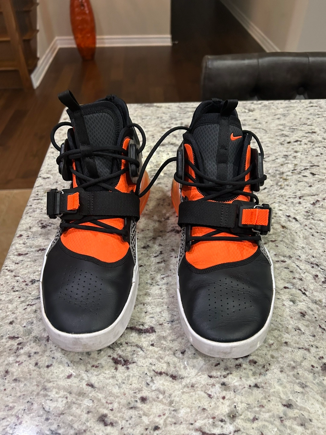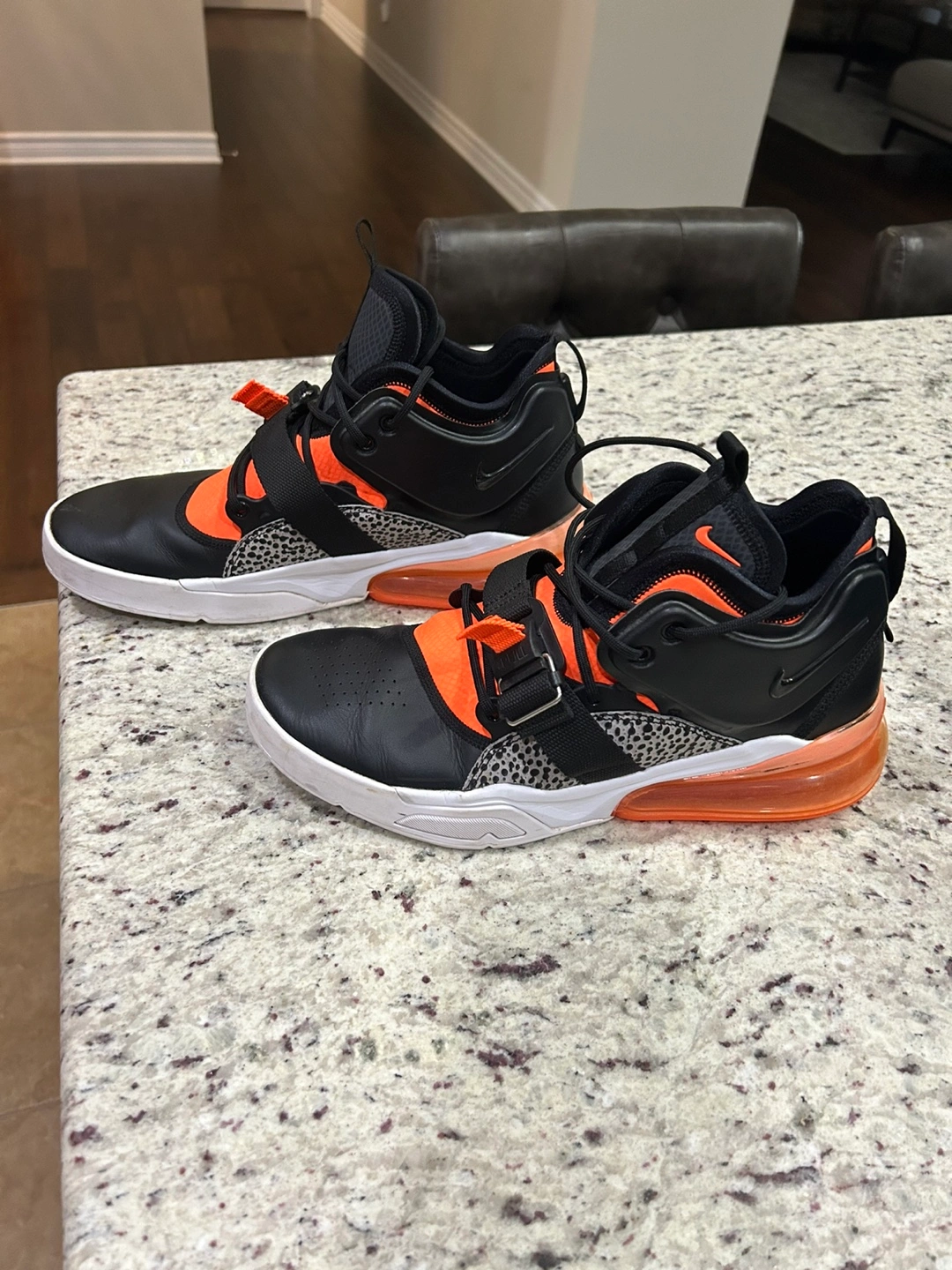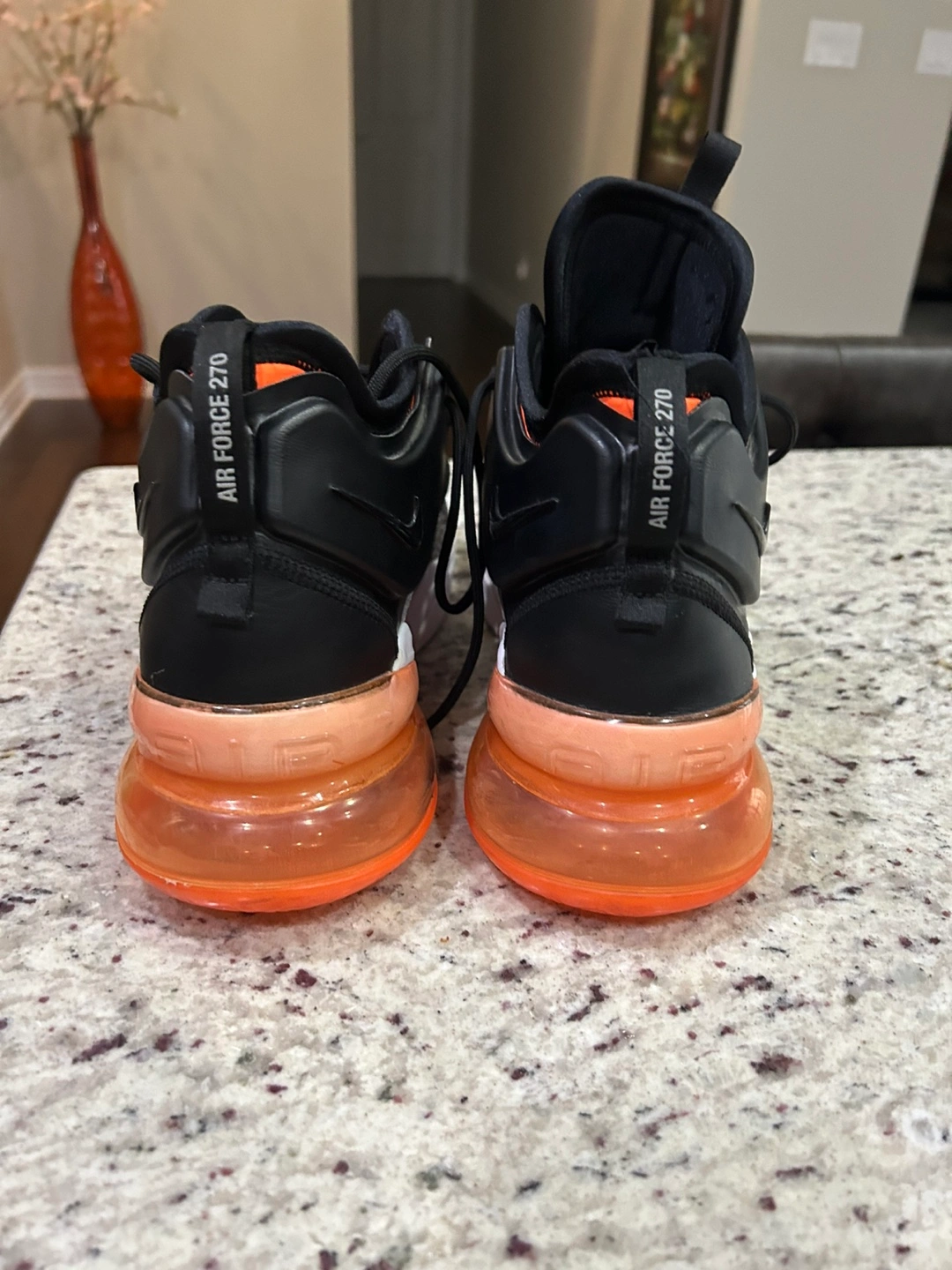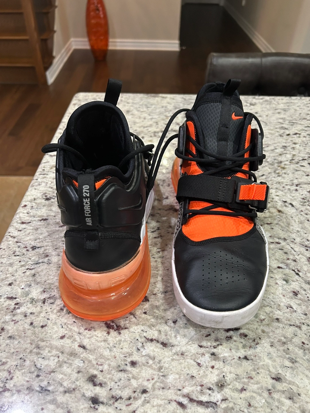 Nike Air Force 270 shoes. Black and orange colourway. Mid-top style. Features a strap closure.