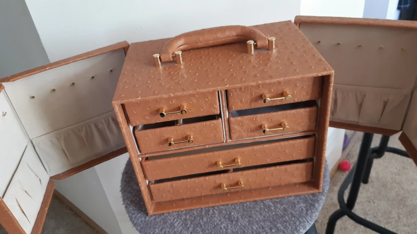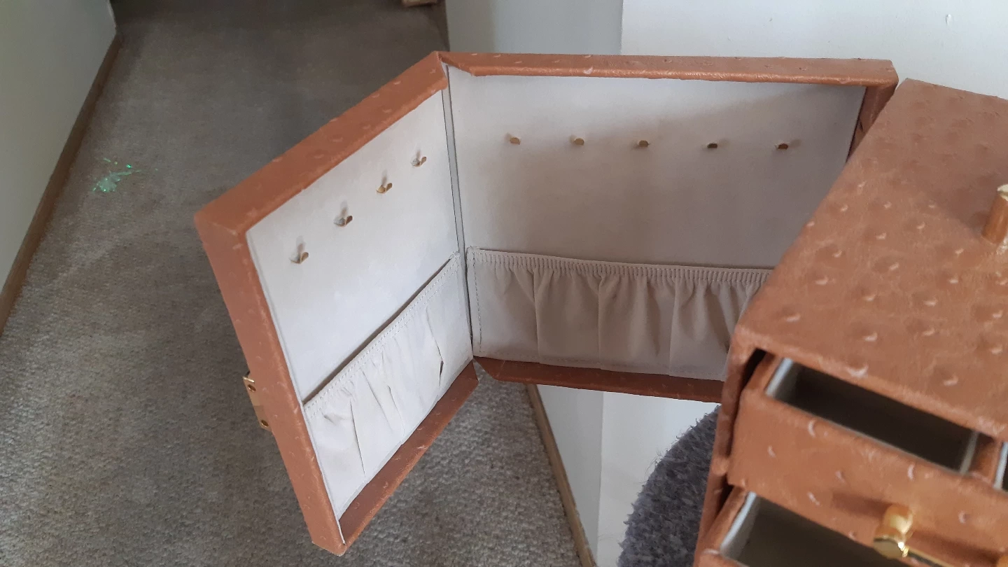 Medium size jewellery case. Multiple drawers and compartments. Ostrich-print exterior. Gold-tone hardware. Perfect for organizing your jewellery collection. pick up location near Southgate mall.
