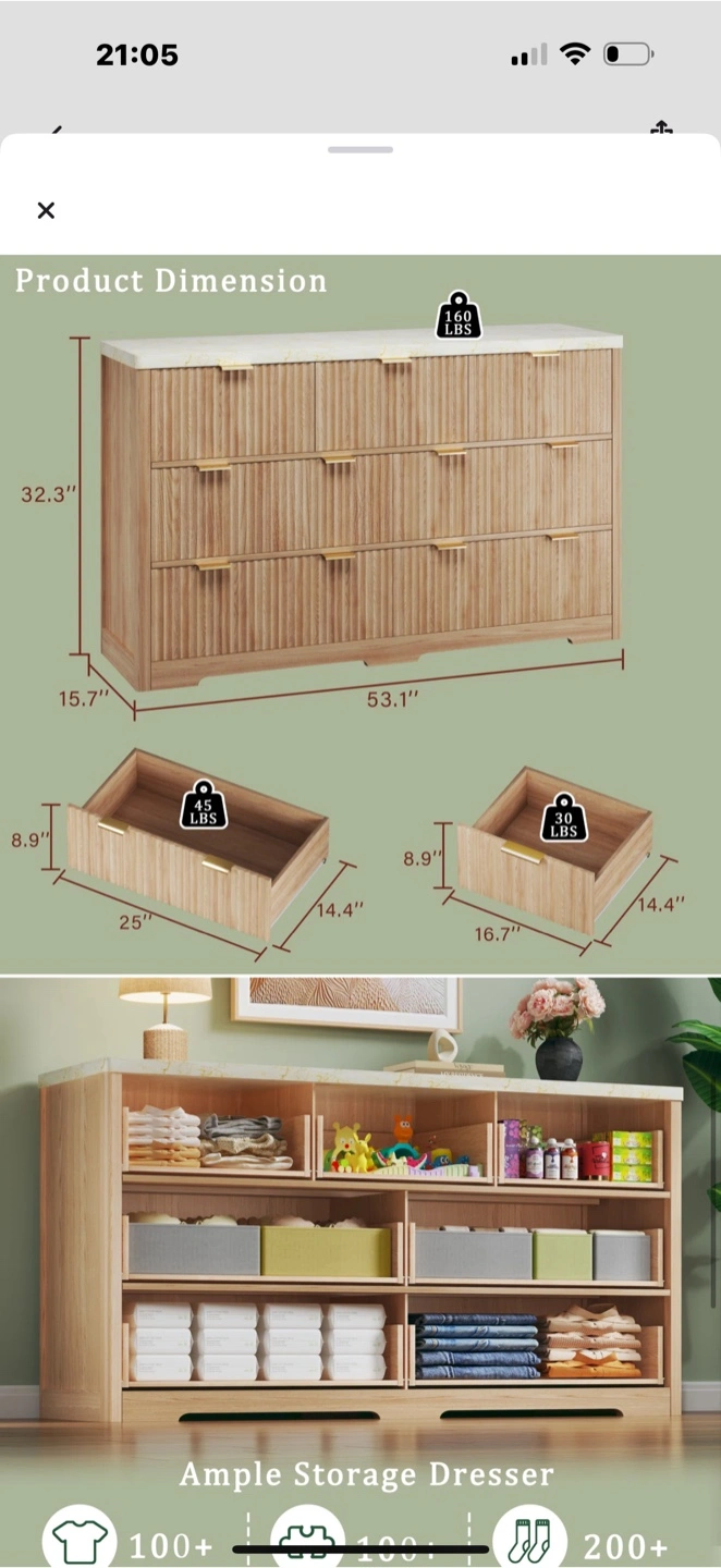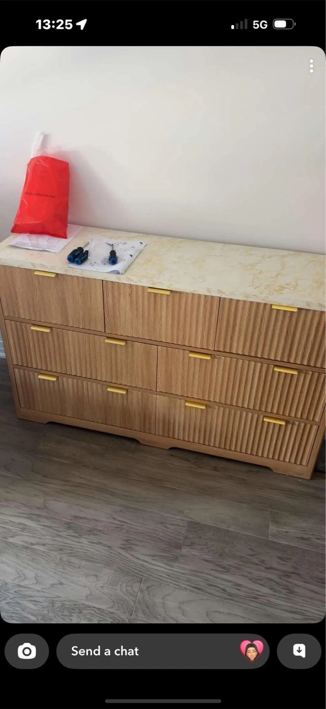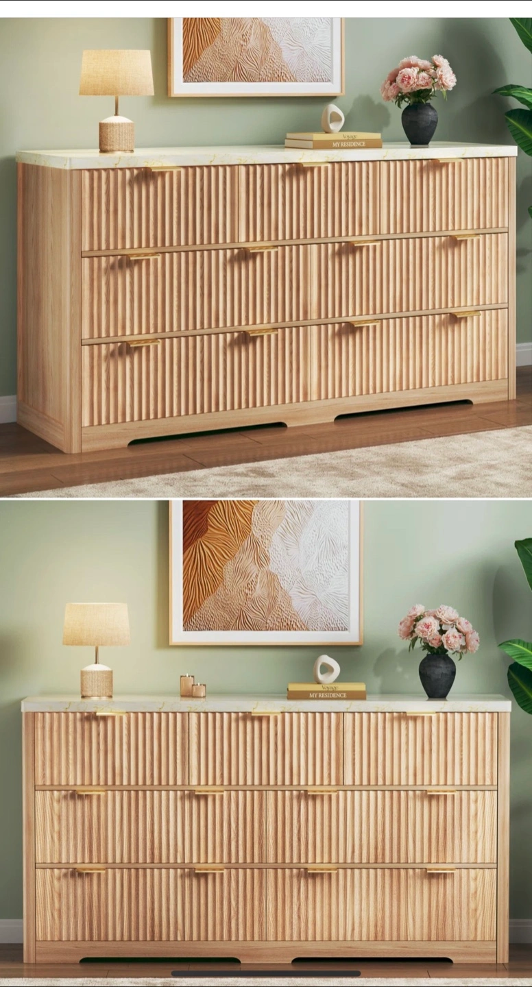 Large wood dresser, seven drawers. Fluted design, marble top. Gold-toned hardware. Excellent storage solution. From Wayfair. Brand new in box. Paid regular price. Bought another one as this one was delayed and now this is past return period. Looking to get $450 obo. Pick up no deliveries.