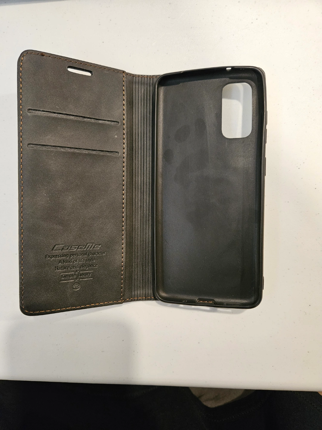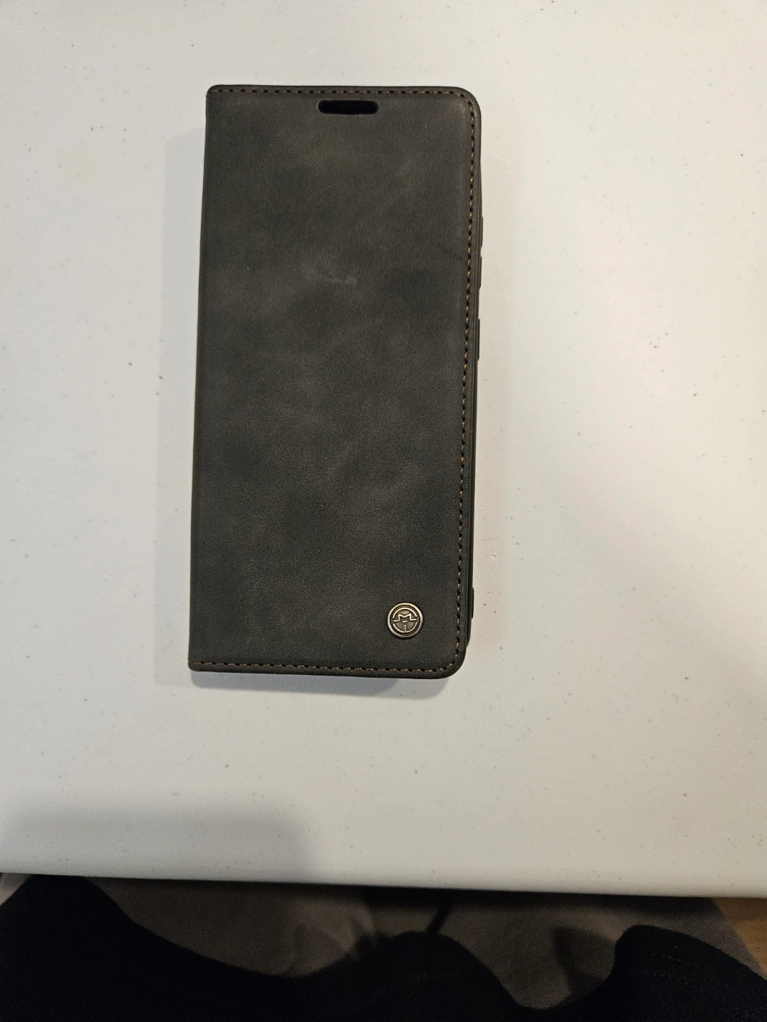 - Dark grey leather wallet case.