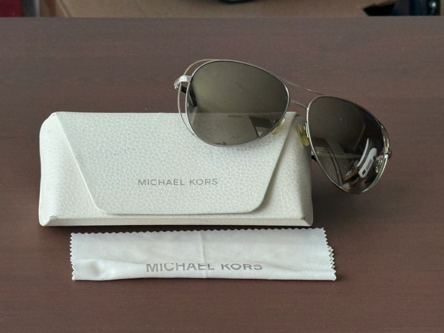 Silver aviator sunglasses. Comes with a hard case and microfiber cleaning cloth. Both case and cloth show Michael Kors branding.