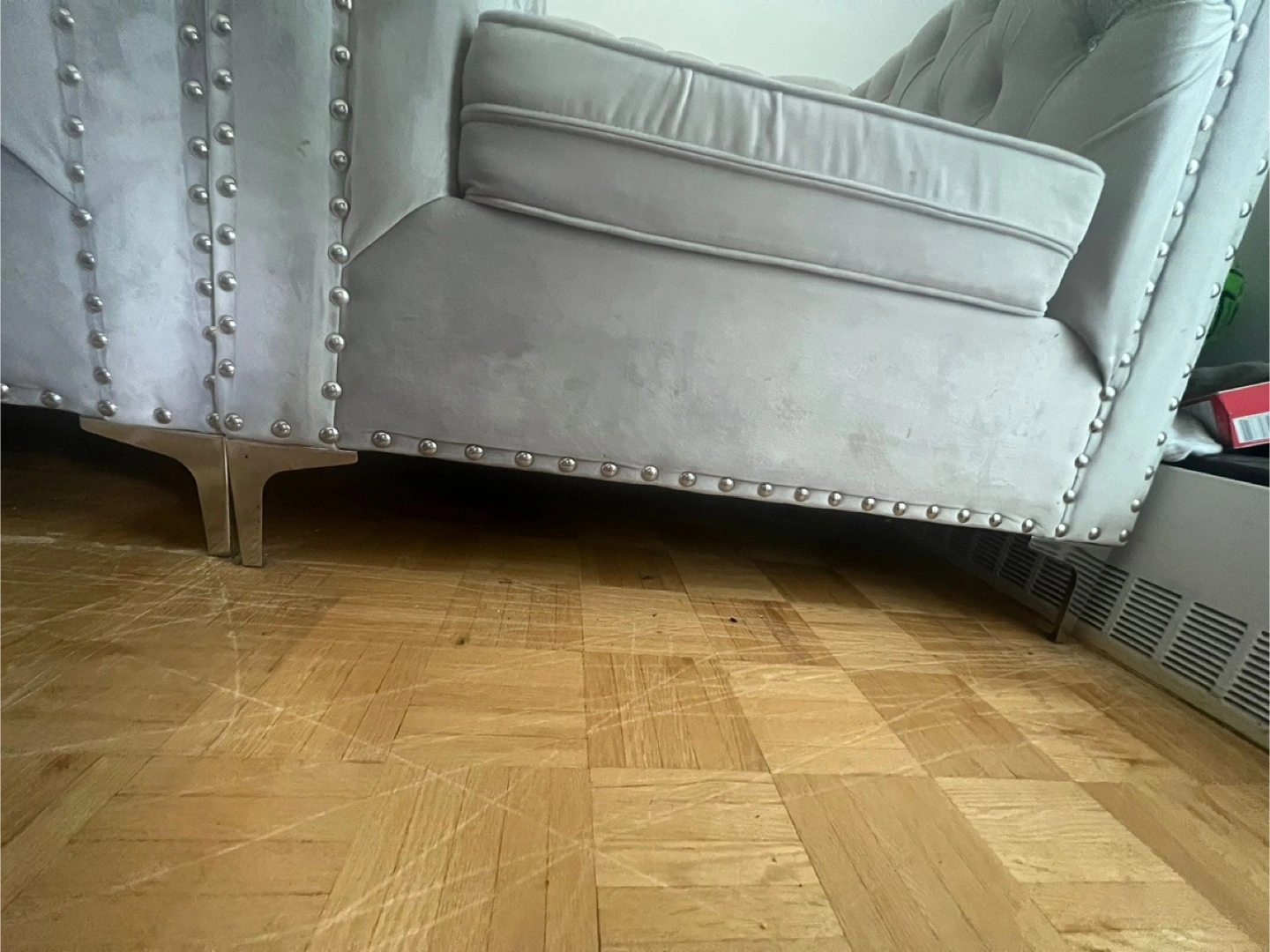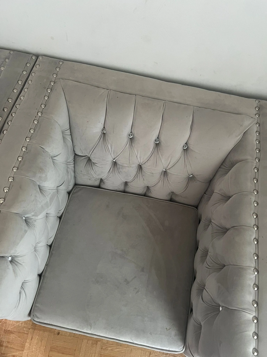 Light grey tufted velvet love seat and arm chair. Features nailhead trim along the edges. Diamond encrusted. Luxurious feel.