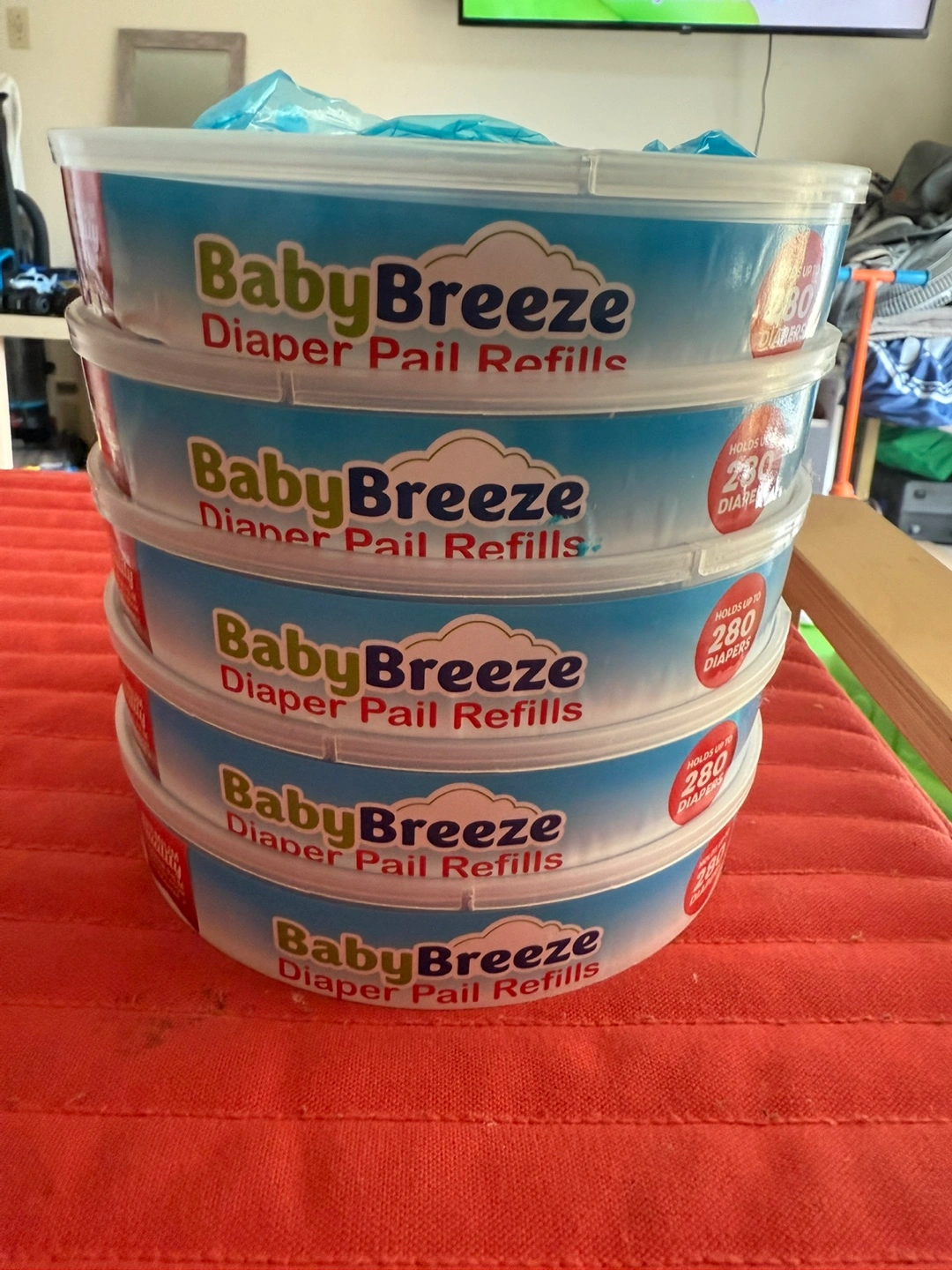 Five unopened Baby Breeze diaper pail refills and Two unopened Parents choice pail refills Holds up to 270-280 diapers each. Great for parents with babies.