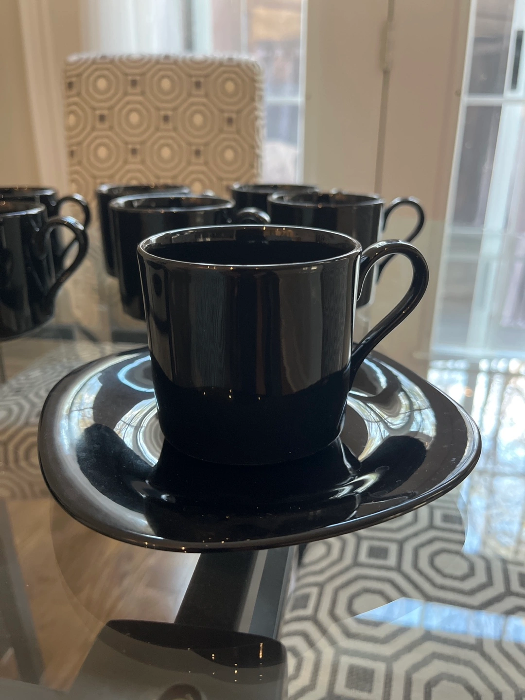Set of six Mikasa black coffee cups and saucers. Made in Japan. Elegant and sleek design. Perfect for everyday use or special occasions.
