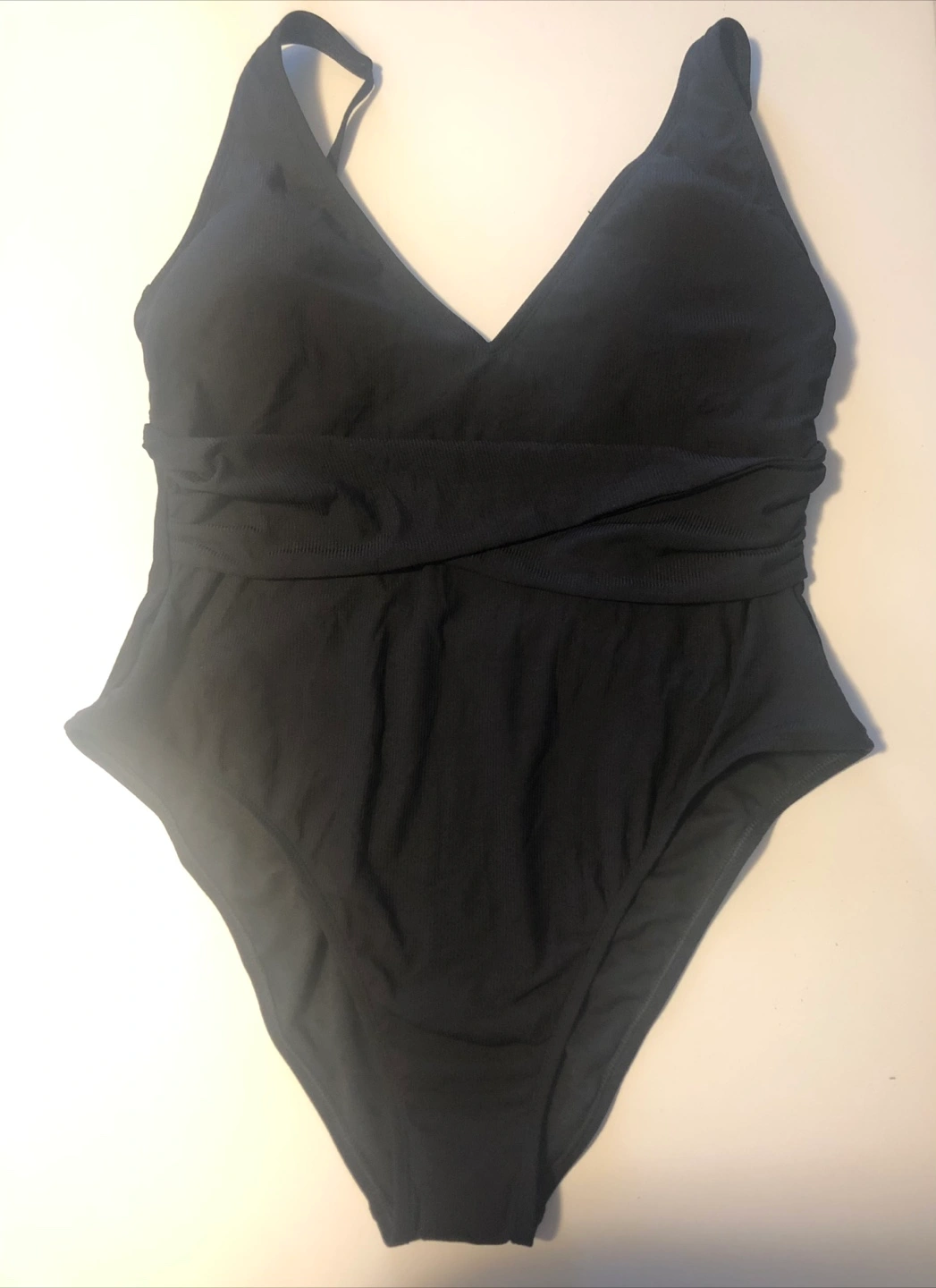 Women's black one-piece swimsuit. Features a V-neckline and a criss-cross design at the waist. Adjustable straps. Open back.