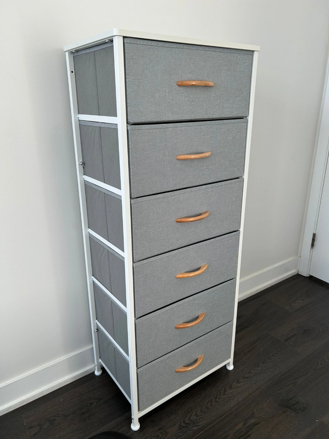 Grey foldable drawers, white metal frame. Drawers made of non-woven fabric, light weight but durable.