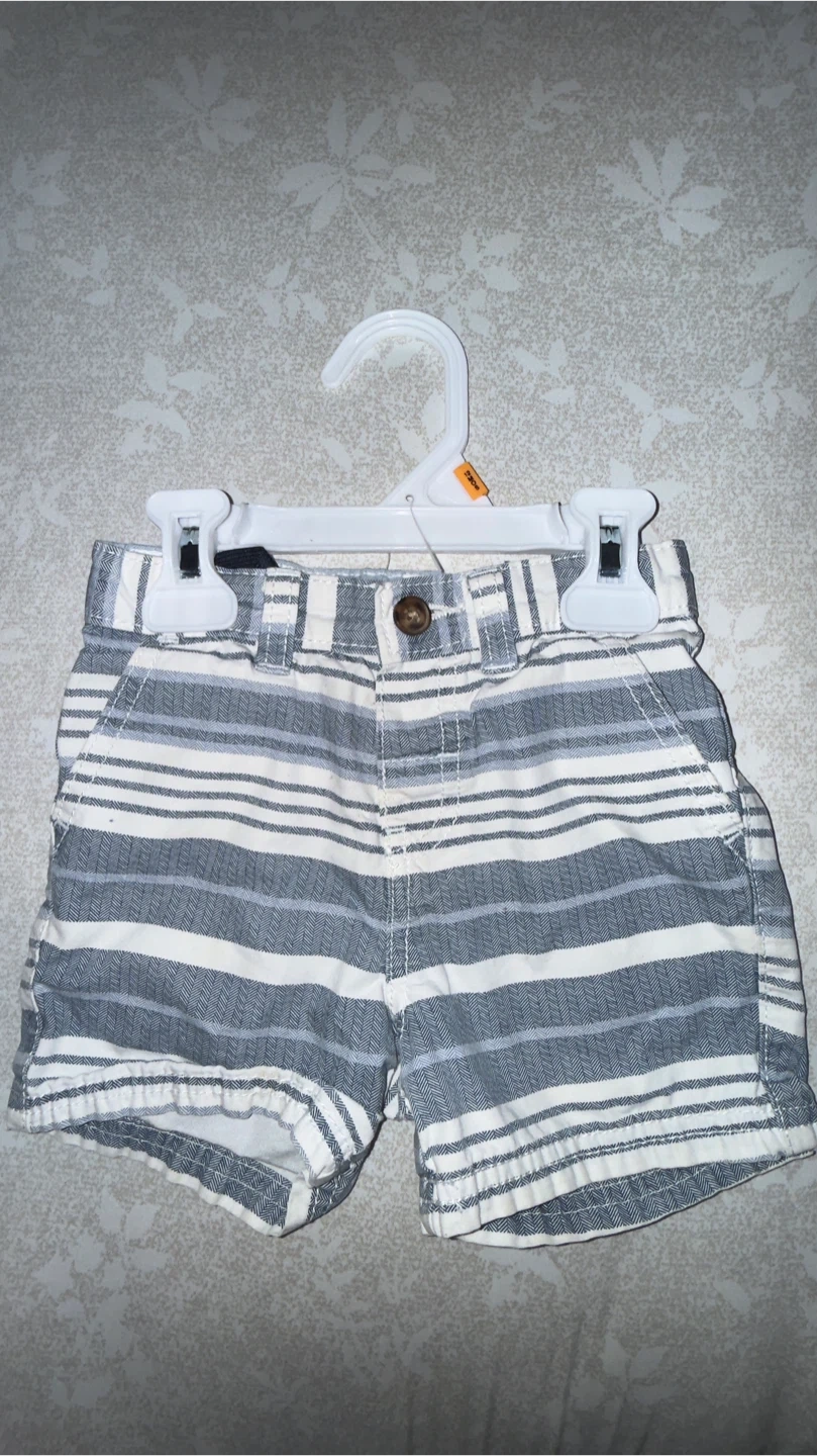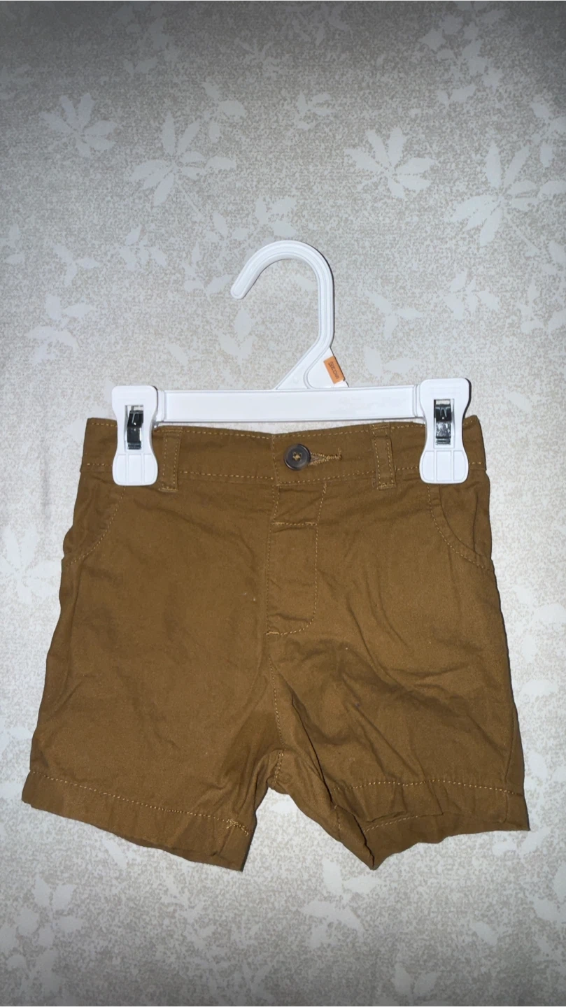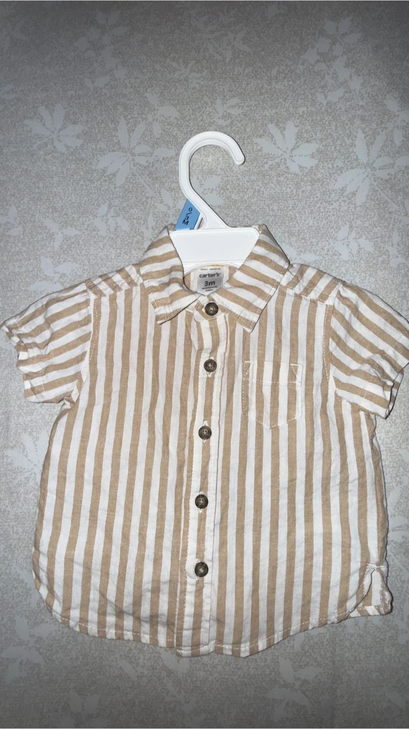 Here's a cute Carter's baby shirt in size 3M! It features a stylish striped pattern and is perfect for your little one. Also included are a red plaid shirt from Place, and two pairs of brown shorts.