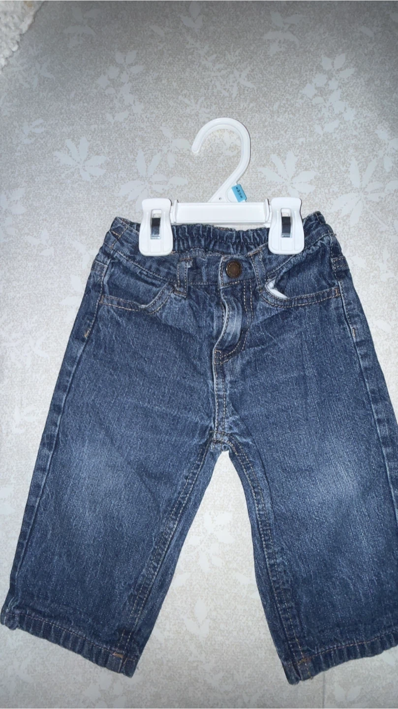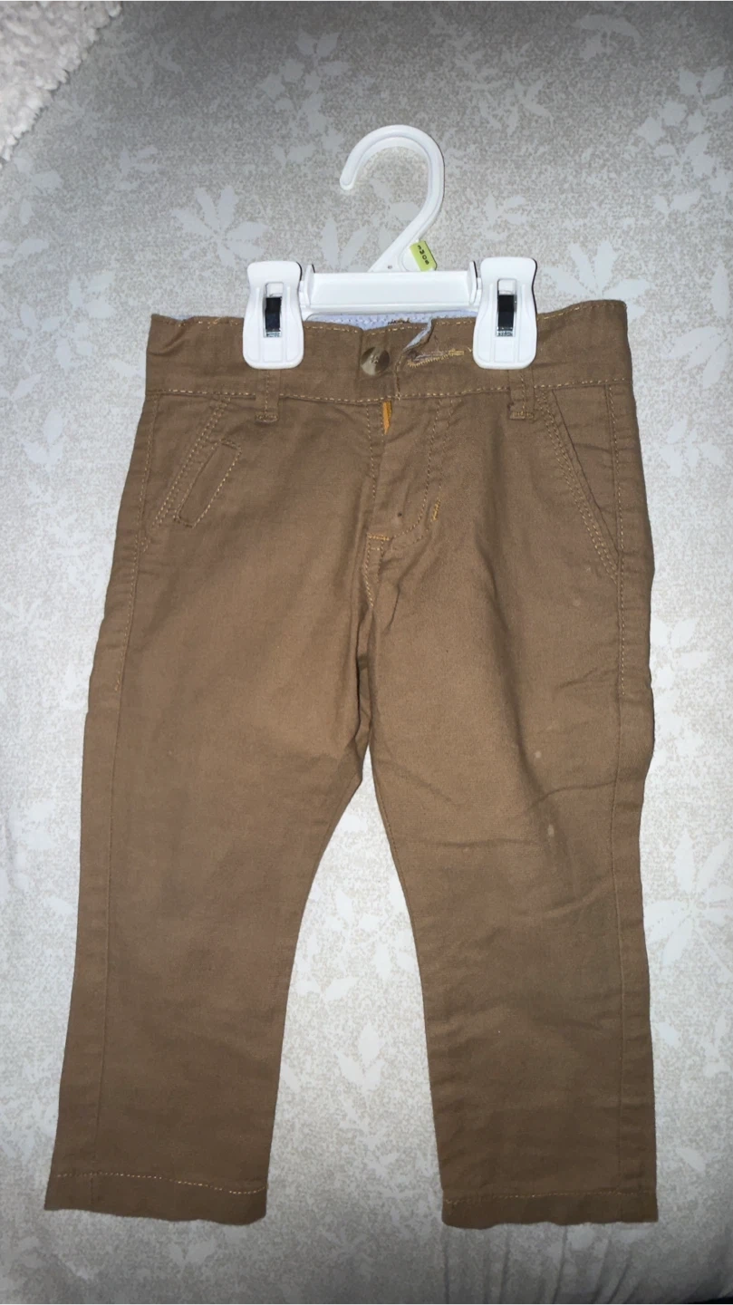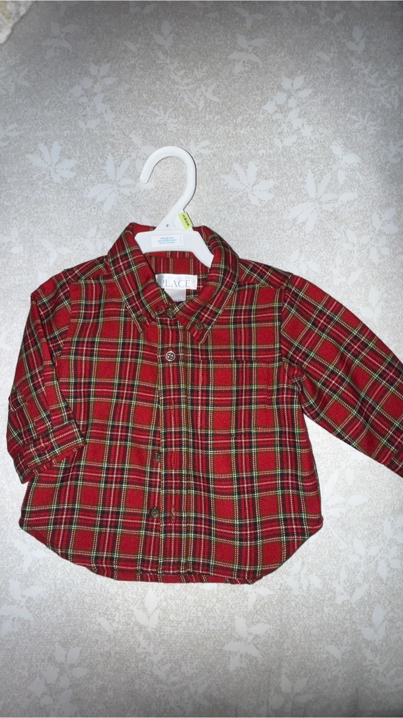 Here's a cute Carter's baby shirt in size 3M! It features a stylish striped pattern and is perfect for your little one. Also included are a red plaid shirt from Place, and two pairs of brown shorts.