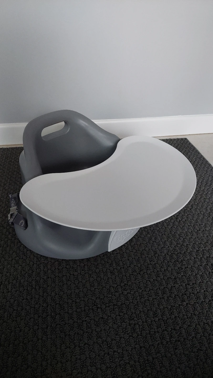 This grey Infant Upseat booster seat is designed for little ones to use at a table. Seat can be secured to dining room chairs. It comes with a detachable tray for convenient meal times. Plastic material makes it easy to clean.