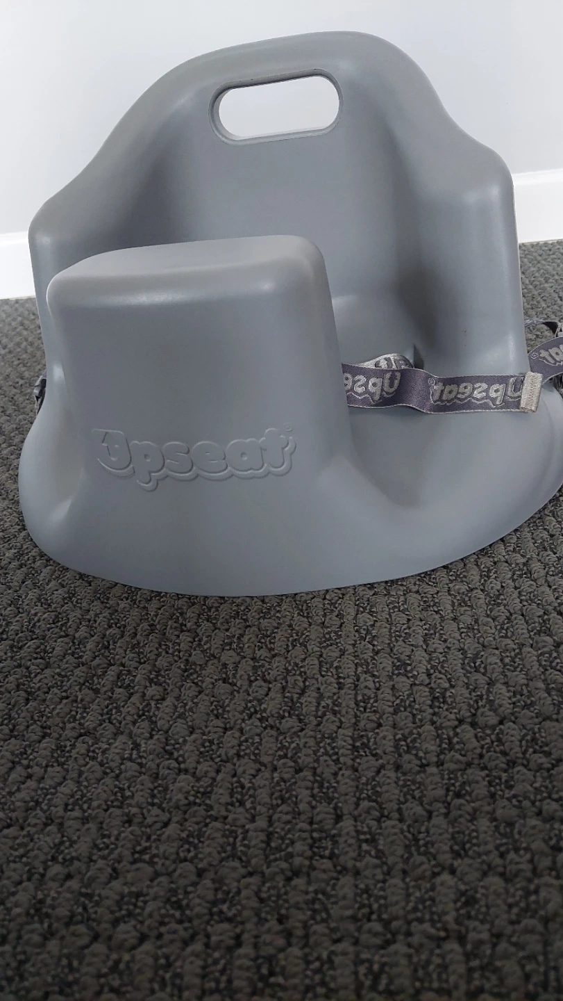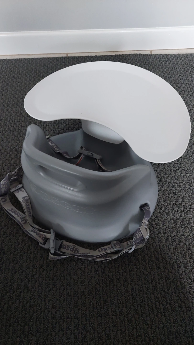 This grey Infant Upseat booster seat is designed for little ones to use at a table. Seat can be secured to dining room chairs. It comes with a detachable tray for convenient meal times. Plastic material makes it easy to clean.