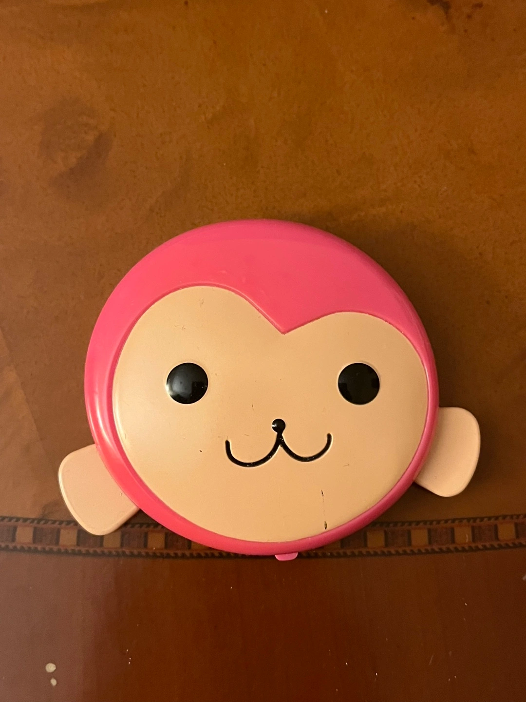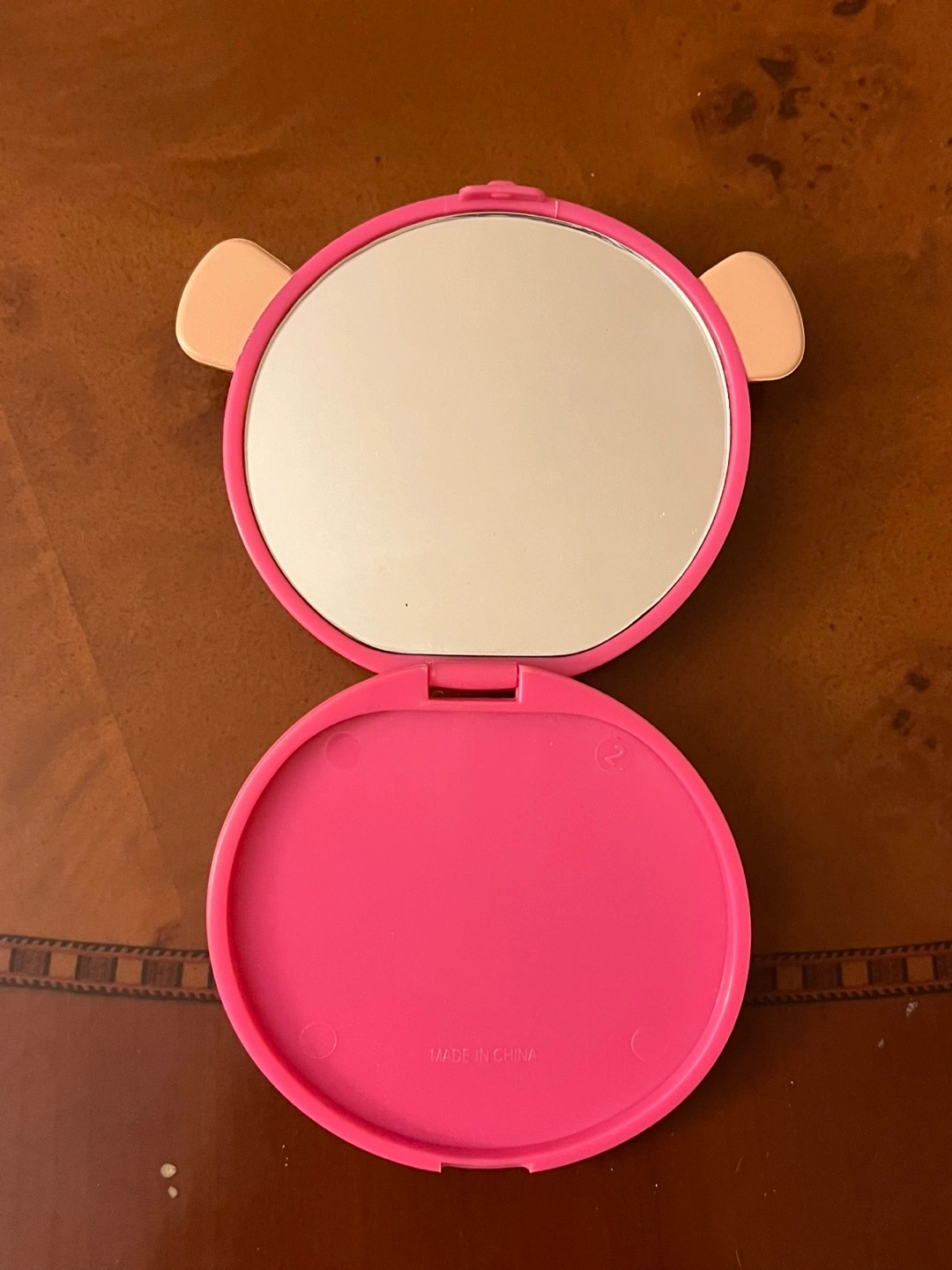 Adorable pink monkey-shaped compact mirror. Perfect for your purse or travel. Small and portable. Features a round mirror and a pink case.