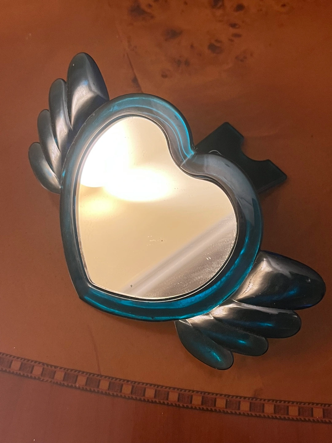 Cute heart-shaped hand mirror. Features small wings on either side. Compact size, perfect for travel or a purse. Shows minor wear.