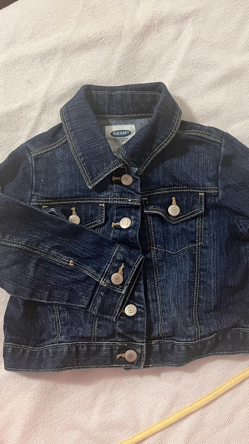 Dark wash denim jacket. Button closure. Long sleeves. Pockets.