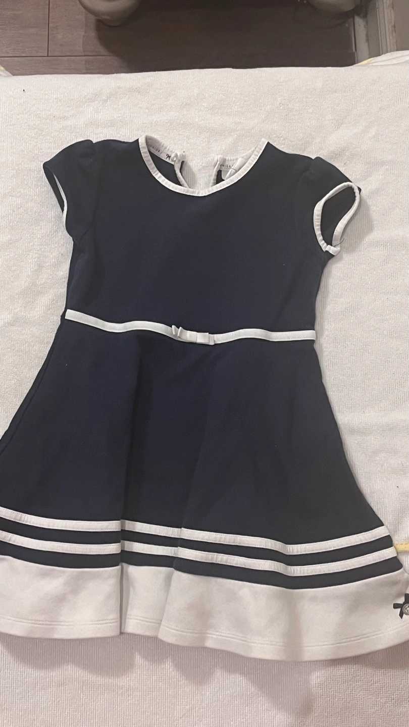 Adorable navy blue dress. White accents and ribbon detail. Short sleeves. Perfect for a special occasion.