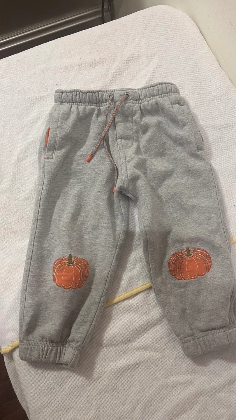 Bundle includes three items: orange plaid shorts, grey sweatpants with pumpkin patches, and beige chinos. All toddler sizes. Great for fall and everyday wear.