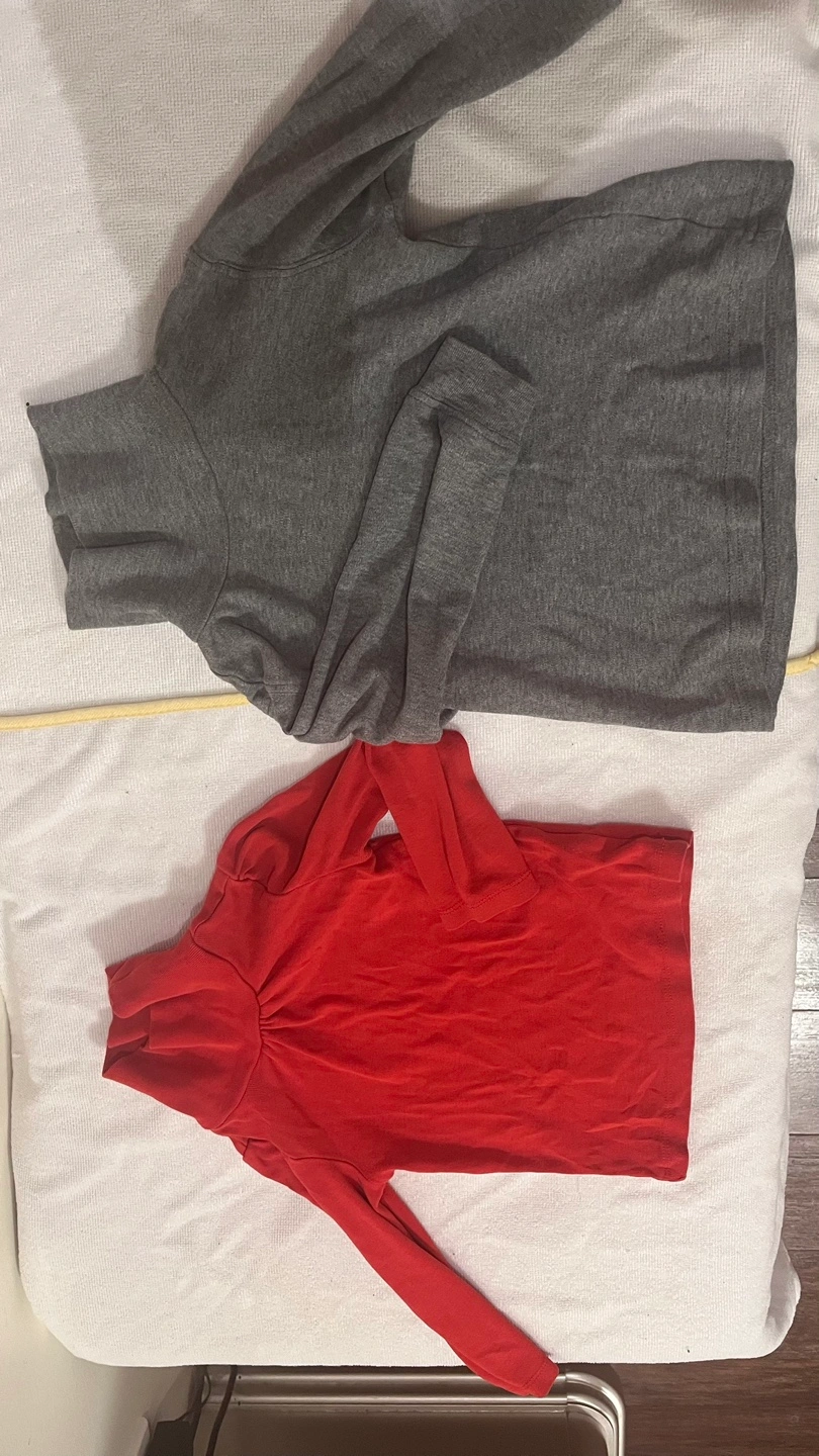Bundle of two long sleeve turtleneck tops. One grey, one red. Good condition. Sizes appear to be comparable.